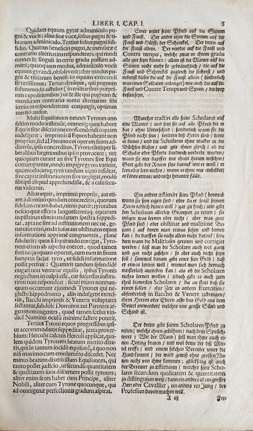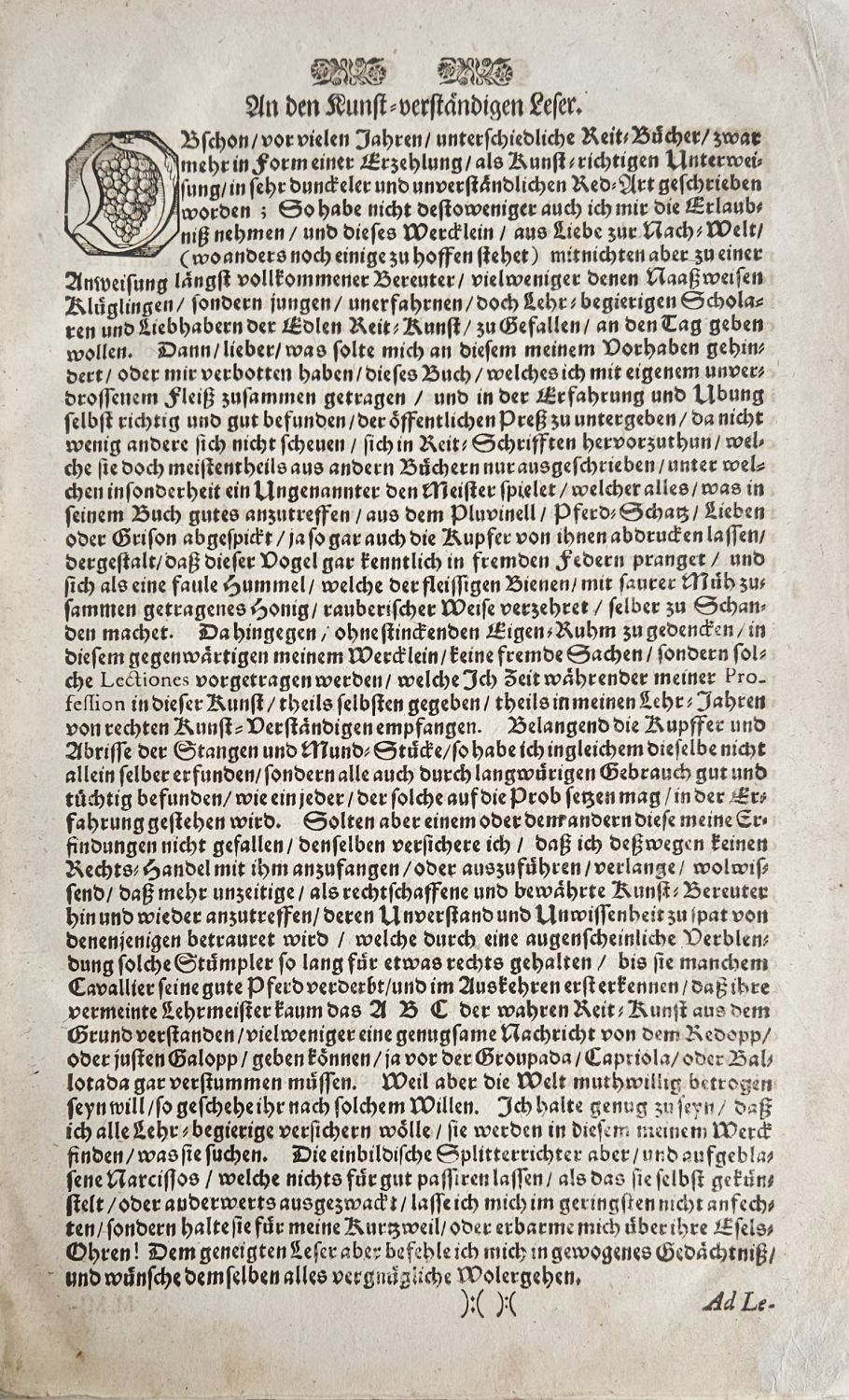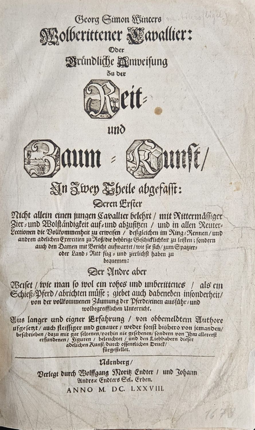 Wolberittener Cavallier: Oder Gründliche Anweisung Zu der Reit= und Zaum=Kunst/ In Zwey Theile abgefasst: Deren Erster Nicht allein einen jungen Cavallier belehrt / mit Rittermässiger Zier= und Wolständigkeit auf= und abzusitzen / und in allen Reuter=Lectionen die Vollkommenheit zu erweisen / deßgleichen im Ring=Rennen/ und andren adelichen Exercitien zu Roß/ die behörige Geschicklichkeit zu leisten; sondern auch den Damen mit Bericht aufwartet/ wie sie sich/ zum Spatzier= oder Land=Ritt füg= und zierlichst haben zu bequemen: Der Andre aber Weiset/ wie man so wol ein rohes und unberittenes/ als ein Schieß=Pferd/ abrichten müsse; giebet auch dabeneben insonderheit/ von der vollkommenen Zäumung der Pferde/einen ausführ= und wolbegreifflichen Unterricht. Aus langer und eigner Erfahrung / von obbmeldtem Authore ufgesetzt/ auch fleissiger und genauer / weder sonst bishero von jemanden/ beschrieben/ dazu mit gar seltenen/ vorhin nie gesehenen/ sondern von Ihm allererst erfundenen/ Figuren/ b