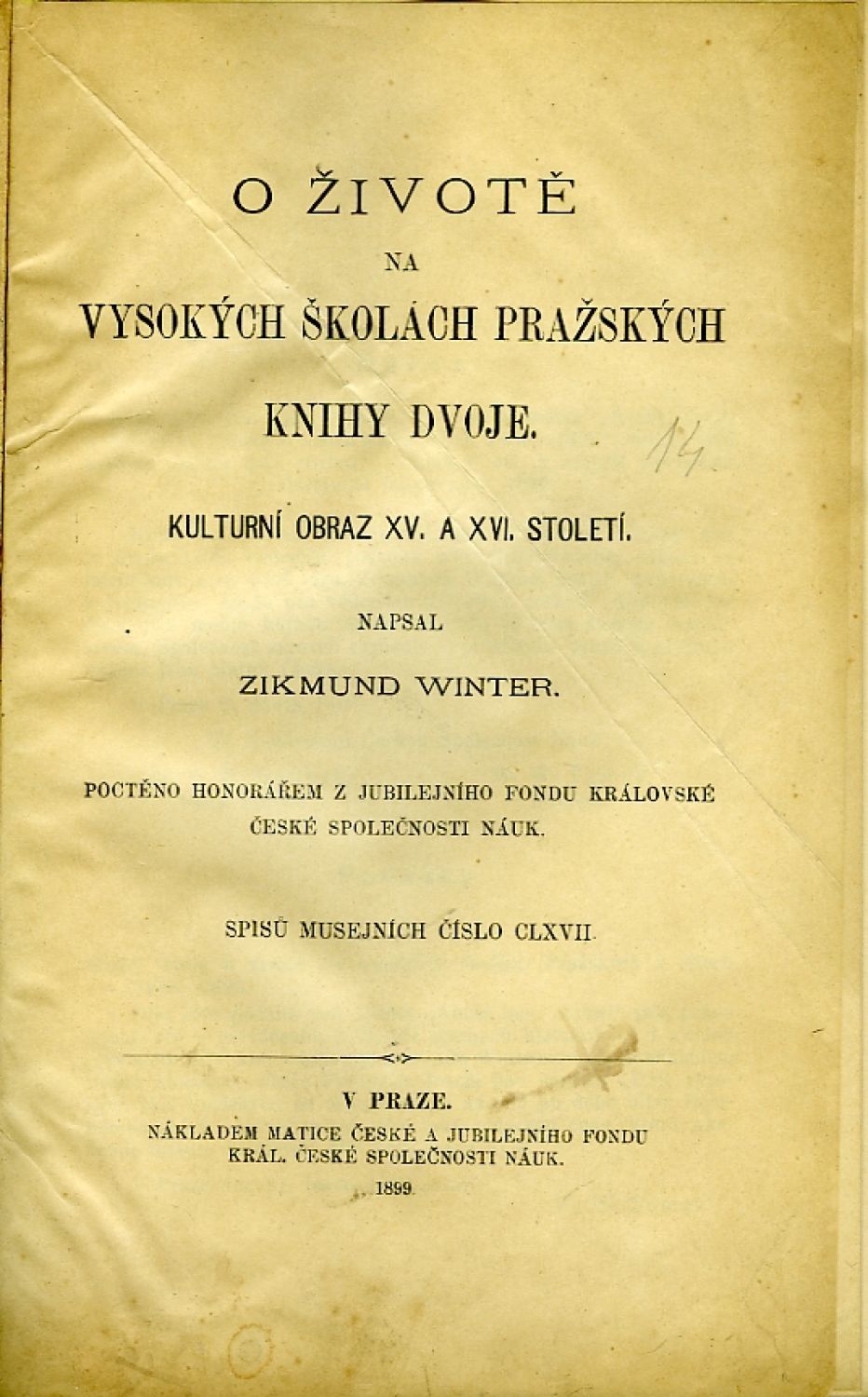 Spisů musejních číslo CLXVII, Novočeské bibliothéky vydávané nákl. Musea Král. českého č. XXXII. - Modrá plátěná vazba se zlac. věcným názvem na hřbetě, žlutá svrchní ořízka. Předtitul potrhaný, podlepený a se skvrnami od vody, tit. list pomačkaný a na okrajích zahnědlý, jinak listy čisté.