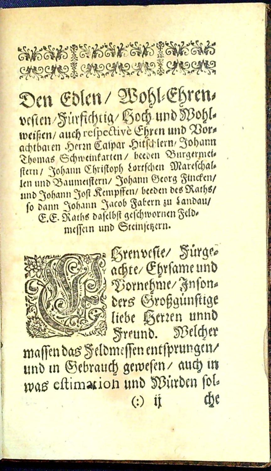 Bewerte Feldmessung{ und Theilung: mit vorgehender Verzeichnuß der Mängel/ so bißhir darin gewesen: richtig/ kurtz/ zum Brauch bequemb/ gestelt/ Vom Pfarherrn zu Langeforch/ an den Stattschreiber zu Breitenaw/ Erstlichen getruckt zu Heidelberg/ Im Jahr 1578. nach der hand zu Straßburg/ A. 1628. Anjetzo auff= neue wieder auffgelegt und getruckt.