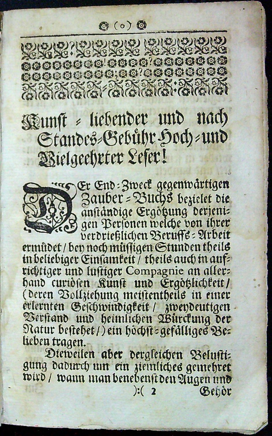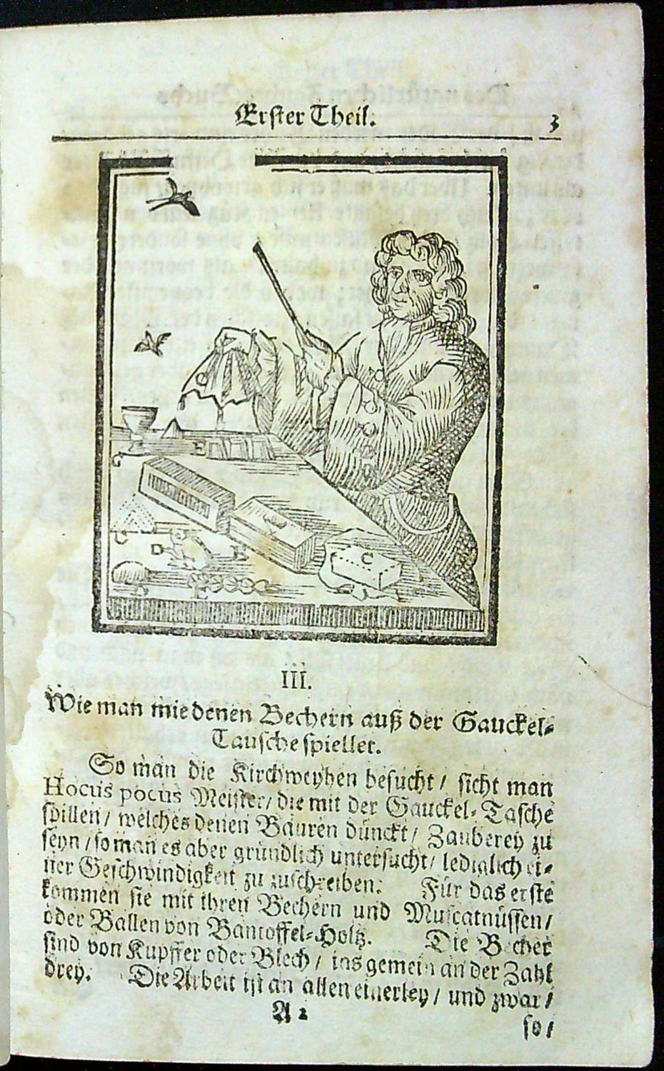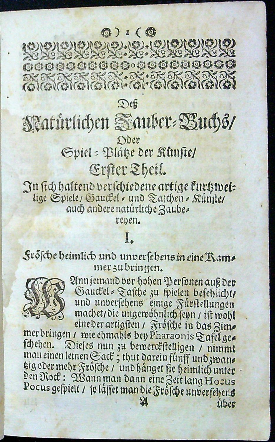 Natürliches Zauber=Buch Oder neuer Spiel=Platz der Künste, In welchen über die tausend Zauber=Stücke, so wohl aus der Gauckel=Tasche als den Karten=Spiel, zusammt vielen andern Mathematischen und Physikalischen Künsten anzutreffen, Benebenst einen vollständigen von verschiedenen wohlriechenden Wassern, Pulver und Balsam, beydes die Hände als das Angesicht von aller Befleckung rein, sauber und nett zu erhalten; Ehemals in niederländischer Sprache beschrieben, vorjetzo aber hochteutsche übersetzet, mu vielfältigen Ausgaben aus denen neusten Französischen Autoribus vermehret, und zu des curiösen Lesers sonderbahren Nutzen und Ergötzung dem Druck übergeben von S. W.