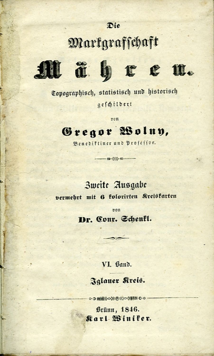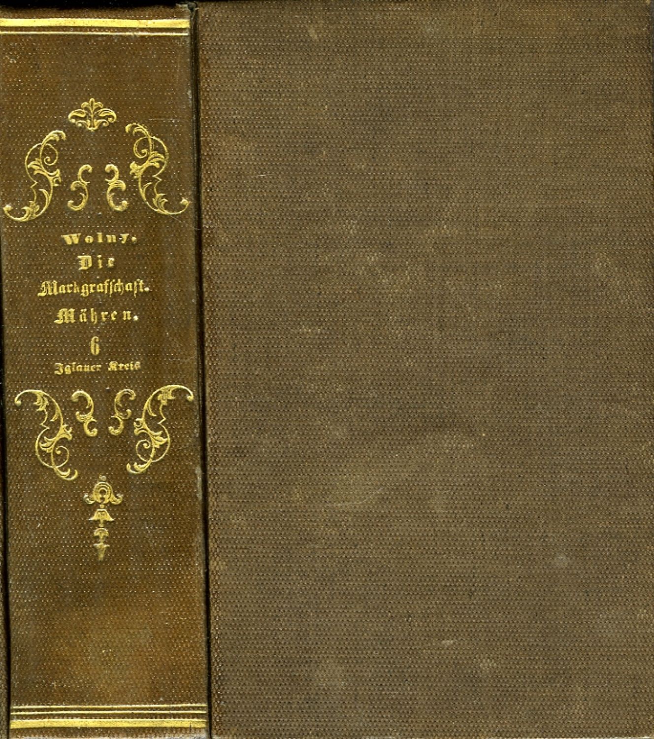 Tištěno frakturou, latinská slova antikvou, tištěné poznámky pod čarou. Druhé vydání bylo rozšířeno o šest kolorovaných map jednotlivých krajů, v každém svazku jedna - v námi nabízeném exempláři chybí. - Vazba potažená hnědým plátnem, ve hřbetu tlačené a zlacené ozdůbky z ornamentů a věcný název s číslem svazku, barvené ořízky. Papír místy zažloutlý, tu a tam v textu drobné hnědé skvrnky. Na předním přídeští nalepené ex libris s iniciálami ZMZ (Na předním přídeští nalepeno ex libris s iniciálami ZMZ (Zdeněk Maria Zenger, byl právník, památkář, grafik, fotograf a významný heraldik. Vytvořil i řadu ex libris). Ve stavu dobrém. <br>Řehoř Tomáš Volný (1792-1871), opat benediktinského kláštera v Rajhradě u Brna, profesor historie a filologie na brněnském filosofickém ústavu.