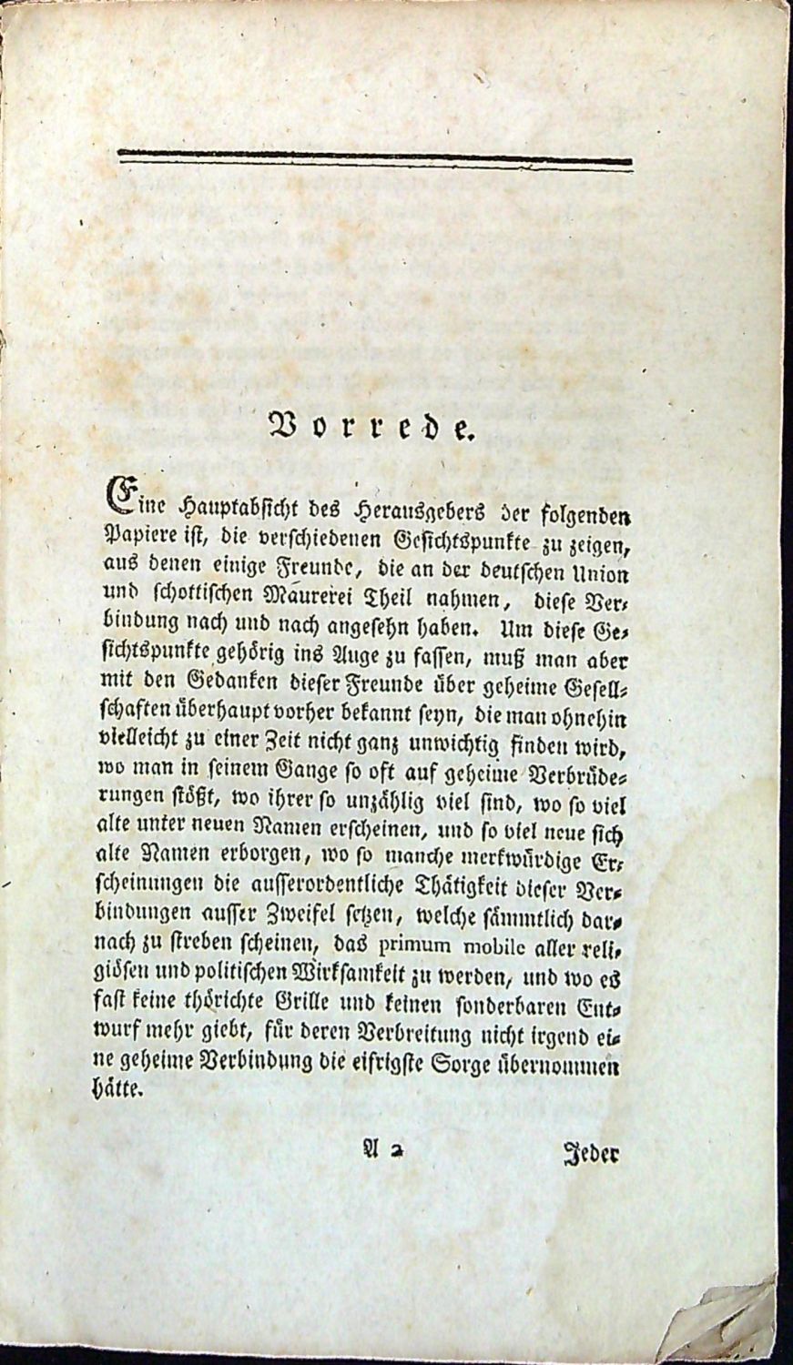 Wolfstieg 43121<br>Tištěno švabachem, tištěné poznámky pod čarou, mizící linky. - Dobová pap. obálka z tragantového papíru, místy vybledlá, ve hřbetu z větší části chybí papírový pokryv, přes hřbet přelepeny dva staré pap. knih. štítky s čísly, přední strana obálky při horním okraji hřbetu natržená, oslí uší, při spodním vnějším okraji stran světle hnědé mapy způsobené vlhkostí. Na tit. listu staré razítko zednářské lóže "Archiv und Bibliothek d. (Loge) Carl zur gekrönten Säule Braunschweig".