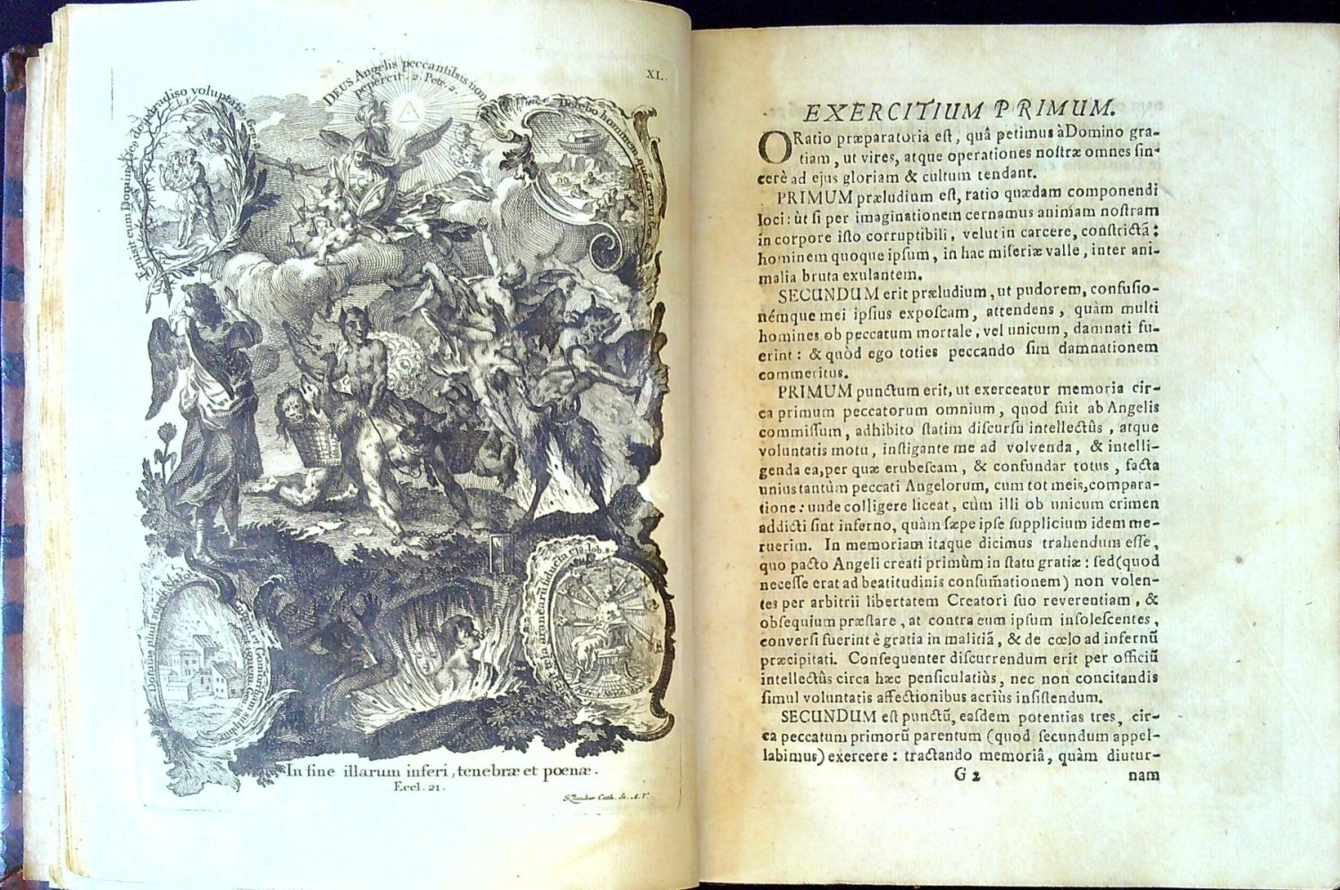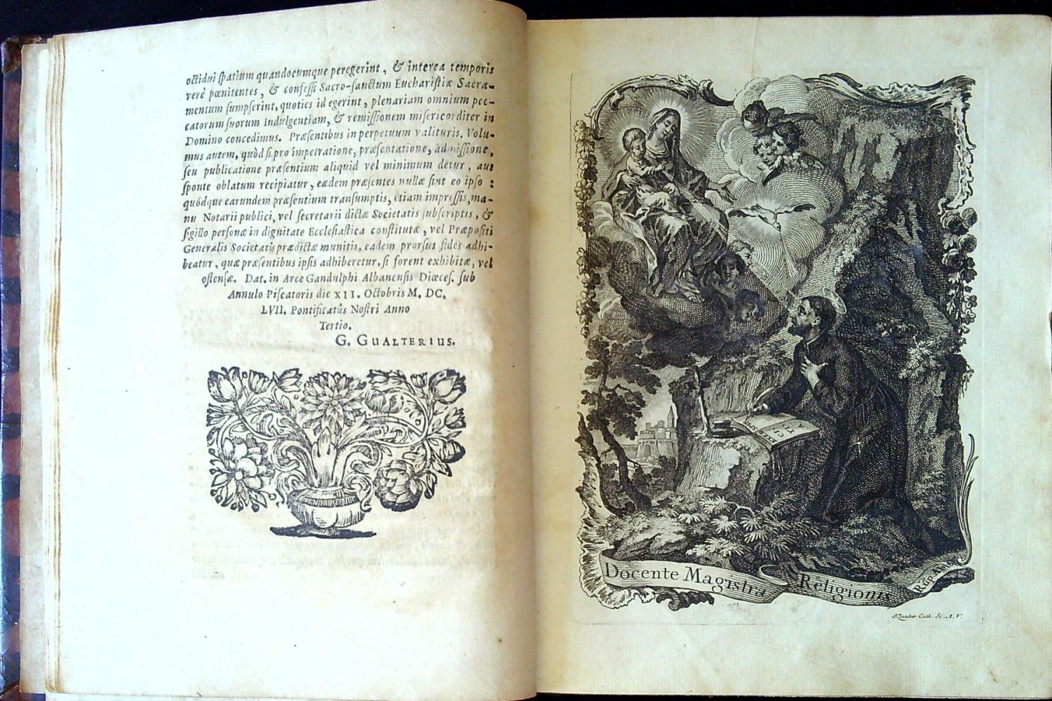 BCBT 10855; Backer-Sommervogel V,65 - námi nabízený exemplář má však odlišného ilustrátora - Klaubera.<br>Titulní list versálkami, impresum oddělené jednoduchou linkou, na tit. str. viněta s emblémem Tovaryšstva Ježíšova, v textu řada dřevořezových vinět bohatého ornamentálního a rostlinného dekoru (květinové, typografické, s holubicemi, s jesuitským emblémem, rozvilinami), konturová iniciála na pozadí rostlinného ornamentu zalomená do výše 7 řádků, tučně tištěné versálky ve výši 2-5 řádků, pásová lišta z rostlinného ornamentu, signatury, nepravidelné kustody. - Ze srovnání s exemplářem s rytinami S. Dvořáka vyplynulo, že text je zcela typologicky, včetně typografické úpravy i výzdoby, shodný. Z neznámých důvodů však již v době vydání knihy někdo nahradil Dvořákovy rytiny, rytinami Klauberovými. Pod Klauberovými rytinami je z velké části stejný rytý text jako pod Dvořákovými. Na foliích A1, Y1, Dd1, Ff1, Gg1, Kk1, Kk2, Mm1, Oo1 a Pp1 jsou Dvořákovy rytiny takřka k nepoznání po celé ploše papíru přelepeny papírem s rytinami Klauberovými, na foliu Hh1 a Ii1 jsou rytiny přelepeny pouze čistým papírem, ostatních 15 rytin je na samostatných z druhé strany nepotištěných listech.<br>Dobová vazba z kartonových desek potažených hnědou hovězinou, ve hřbetu 4 vazy, ve druhém poli světlejší kožený štítek s tlačeným názvem, ve třetím poli zbytek starého pap. knih. štítku, na předním i zadním přídeští a předsádce dobový tragantový papír. Vazba ohmataná a místy mírně odřená, při horním okraji hřbetu lehce natržená, naražené rohy. Na tit. listu perem starý nápis "Bibliotheca" a pak přeškrtaný a nečitelný prov. údaj, na předním vakátu podpis tužkou Jiřího Šalamouna.<br>Bratři Klauberové, Johann Sebastian (cca 1711 - 1768) a Johann Baptist (1712 - po 1787) významní rytci působící v Augspurgu, Johann Sebastian působil i krátce v Praze v dílně Antona Birkharta.