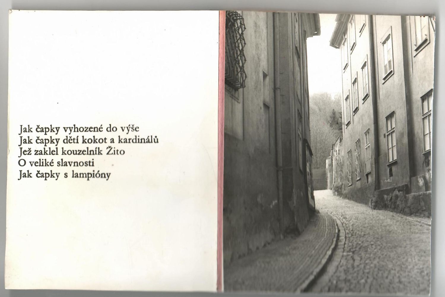 Původní autorský, vlastním nákladem vydaný samizdatový tisk. Šest listů růžového kartonu z obou stran potažených původními fotografiemi pražských zákoutí s Nezvalovým textem, snad fotograficky reprodukovaným (na líci prvního listu název, na rubu text, na líci i rubu posledního listu fotografie). <br>Blok lepený, ve hřbetu potažený částečně odlepenou černou izolepou; původní ochranné kartonové pouzdro.