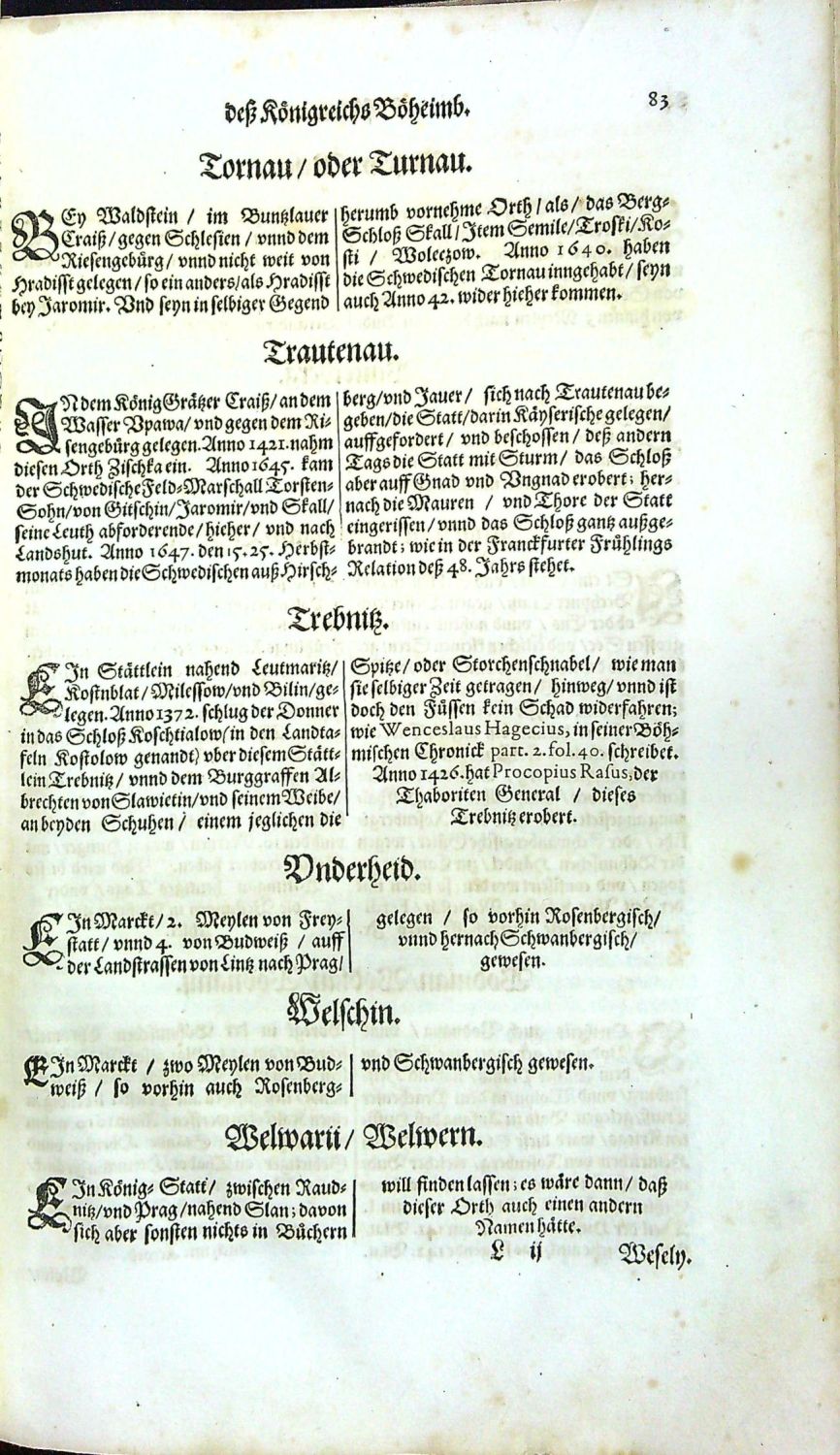 M. Z. [= Martini Zeilleri] TOPOGRAPHIA BOHEMIAE MORAVIAE ET SILESIAE das ist Beschreibung vnd eigentliche Abbildung der Vornehmsten vnd bekandtisten Stätte vnd Plätze in dem Königreich Boheim vnd einverleibten Landern, Mähren, vnd Schlesien. An tag gegeben vnndt Verlegt durch: Matthaeum Merian In Franckfurt. 1650.