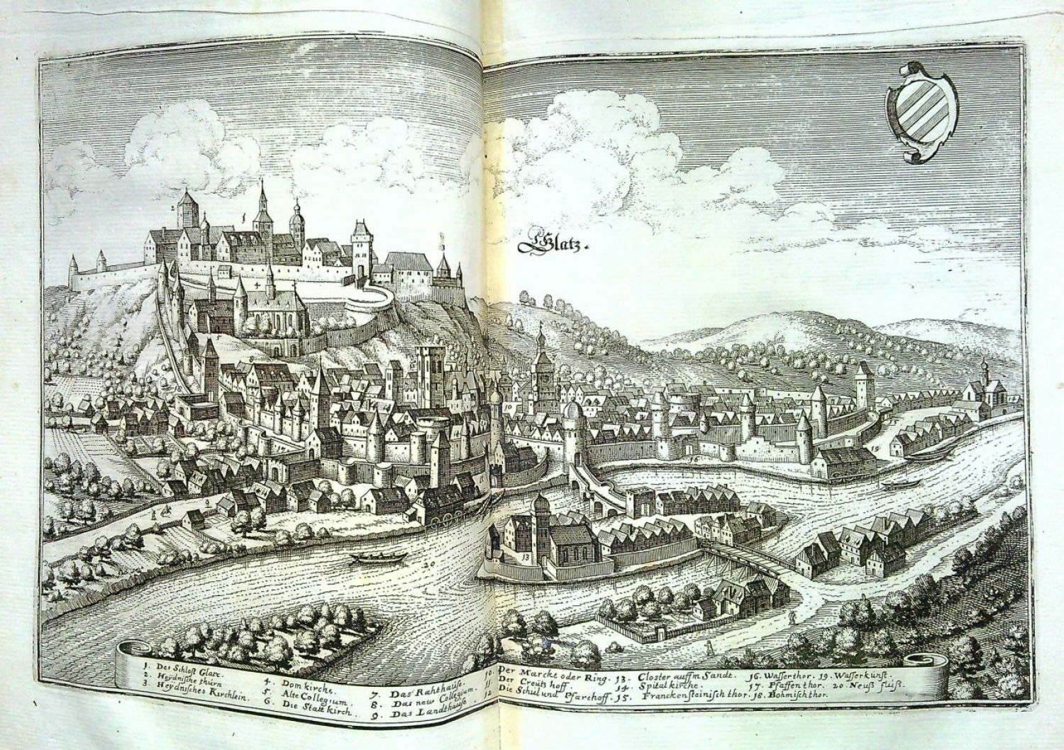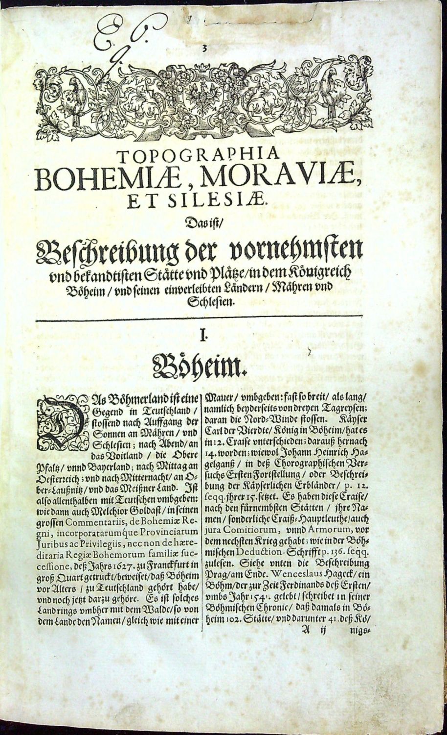 Basilejský a později frankfurtský editor Matouš Merian (1593-1650) vybudoval prosperující nakladatelský dům, který zanikl až roku 1727. V letech 1642-1688 vydával on i jeho následovníci rozměrné jednadvaceti svazkové dílo "Theatrum Europaeum", jehož součástí se stal též svazek věnovaný Čechám, Moravě a Slezsku. Krátký historický text ke každé lokalitě napsal Martin Zeiller (1589-1661), vychovatel v německých šlechtických rodinách.