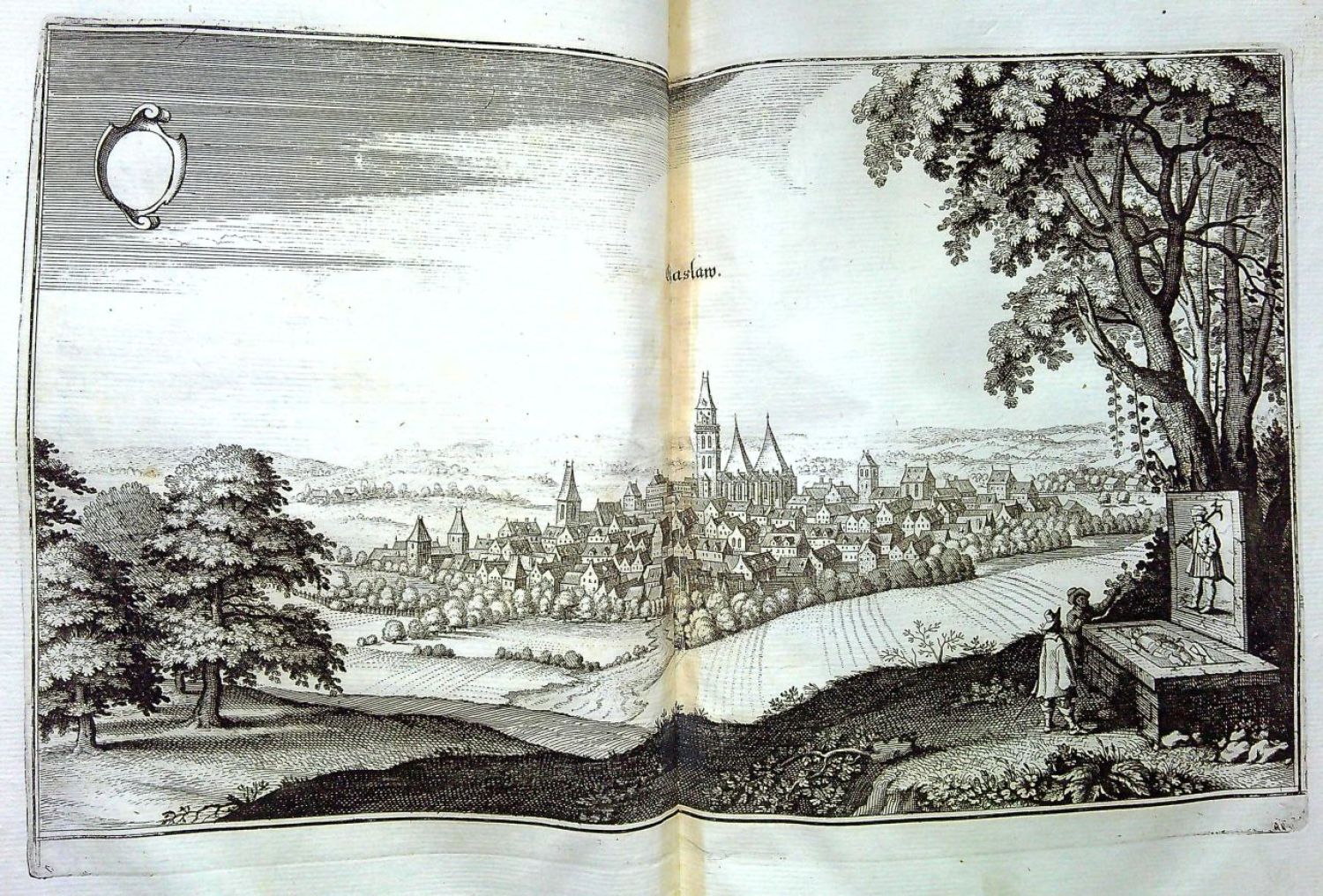 | Ilustrace: | Rytý tit. list s Českými lvy a zemskými znaky v kartuších na horní a dolní straně portálové architektury, vlysy, plné iniciály na ornamentálním pozadí, koncová dřevořez. viněta, 3 dvoulistové mědirytové mapy: za str. 8 anonymní Čechy, za s. 86 Komenského mapa Moravy a za s. [116] mapa Slezska od Martina Helwiga + 32 (z 34) dvoulistových a nesignovaných vedut a plánů měst: Brandejs (Carlo Cappi del.), Karlovy Vary, Chlumec n. Cidlinou (Cappi del.), Kolín (Cappi del.), Chomutov, Čáslav, Cheb, Kladsko, Hradec Králové (se čtyřmi miniaturami, Cappi del.), Louny, Litoměřice (se čtyřmi miniaturami), Plzeň, Polná, plán Prahy, rozkl. veduta Prahy, Ostrov, Slaný, Tábor, Brno, Jihlava, Nové Město na Moravě, Olomouc, Znojmo, Vratislav (plán s přehnutým okrajem dvoulistu), Vratislav(rozkládací veduta), Hlohov, Lehnice a Nisa (2 podélné veduty na dvoulistu), plán Opole, plán Svídnice, veduta Svídnice a Těšín. |