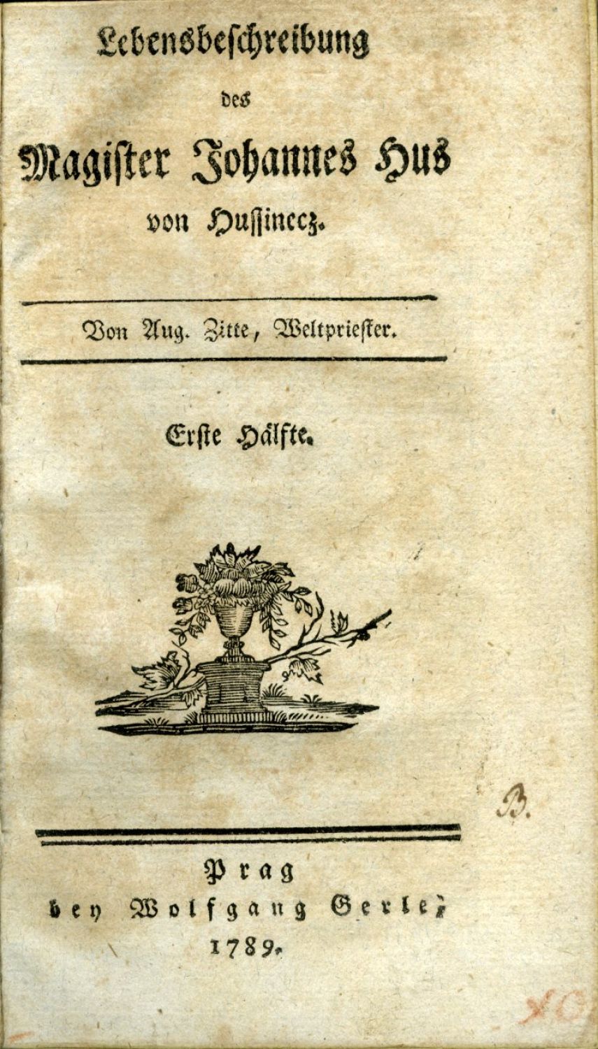 Vazba potažená mramor. papírem mírně odřená, listy (kromě přívazku) průběžně s hnědými skvrnami. - Augustin Zitte (1750-1785), narozen v České Lípě, působil jako kněz v Praze, zabýval se církevními dějinami. Jeho kniha o životě M. Jana Husa byla prohlášena za kacířskou a až do roku 1848 nesměla být v žádné veřejné knihovně. Kaspar Royko (1744-1819), významný theolog, profesor filosofie ve Štýrském Hradci, od roku 1782 na universitě pražské, kde byl v roce 1790 zvolen děkanem theologické fakulty a v roce 1798 rektorem. Zabýval se dějinami koncilu v Kostnici. Nabízené dílo, vydané pod pseudonymem M. Stoyka, je reakcí na Roykova kladného hodnocení učení M. Jana Husa.