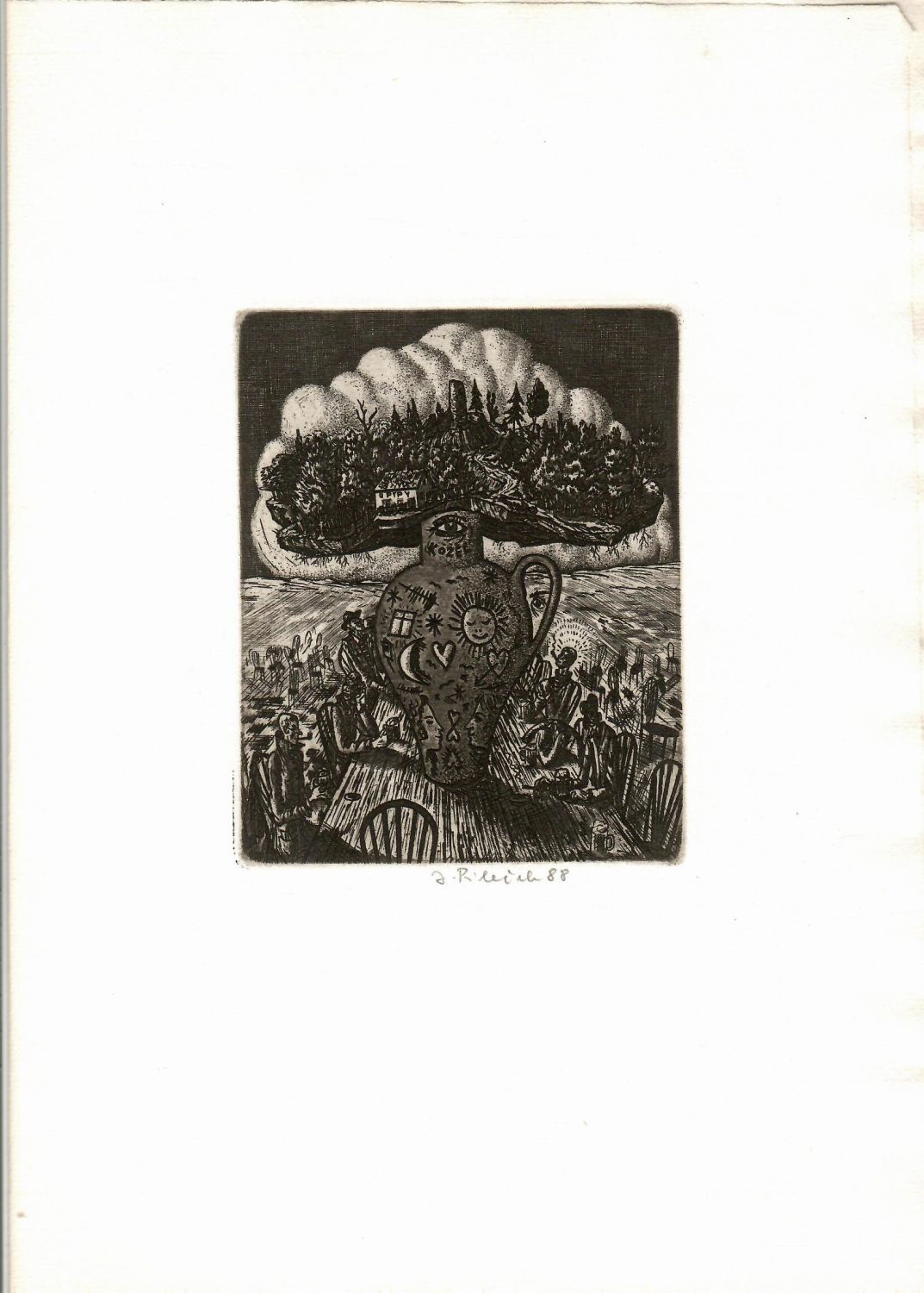 | Ilustrace: | Třemi původními lepty vyzdobil Jindřich Pileček, všechny lepty jsou autorem uprostřed dole pod deskou tužkou podepsané a datované. Původní fotografie od Pavla Váchy, autorem vpravo dole tužkou podepsaná a vlevo dole číslovaná (12/100). |