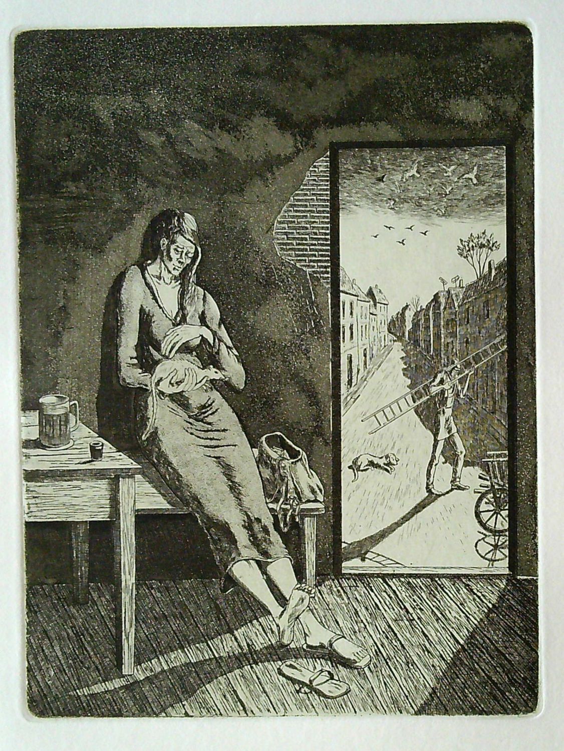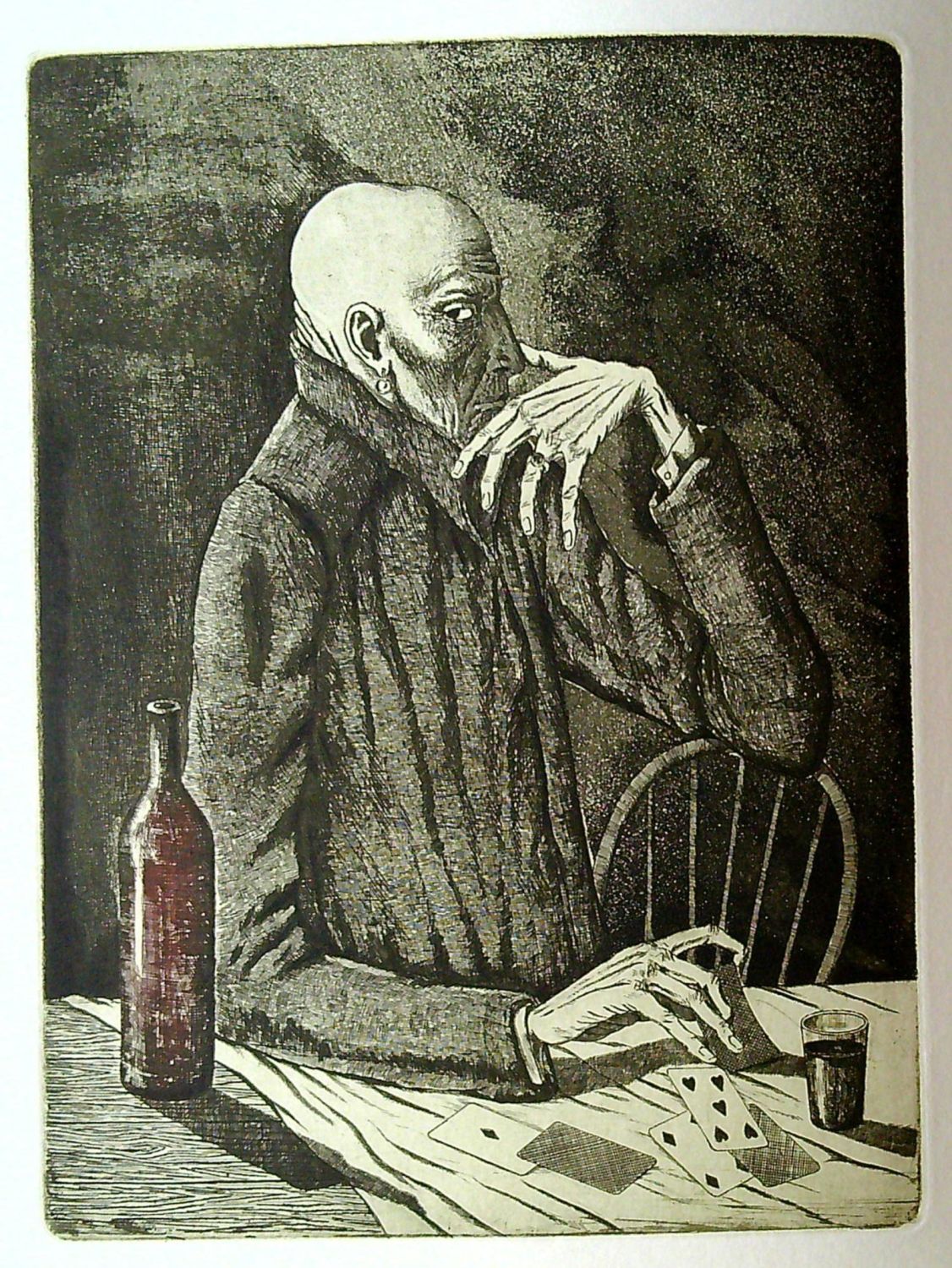 Exemplář číslo 11 ze 100 vydaných a tištěných na plzeňský papír Excudit 170 g, graficky upravil a sazbu z písma Splendid Františka Štorma provedl Bohuslav Šír, grafické listy vytiskli Milan a Pavel Dřímalovi. V tiráži podpis J. Pilečka.<br>Původní kartonová obálka s chlopní, ve které jsou volně vložené složené tiskové archy. <br>Seznam listů: 1. Pokušitel. 2. Přítel potkan. 3. Hra na štěstí. 4. Exšampión. 5. Narozeninové strašidlo. 6. Kocovina. 7. On a ona. 8. Lazebnice. 9. Delirium.