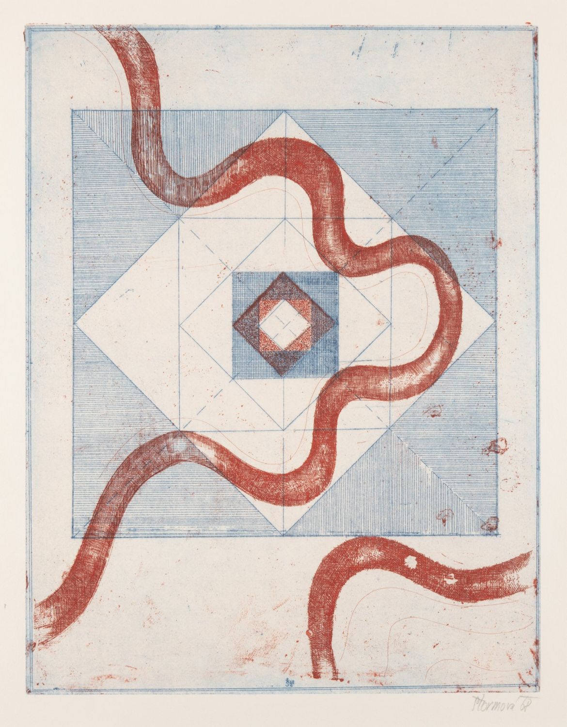 | Barevný lept o rozměru desky 440 x 335 mm (volný list o rozměru 700 x 505 mm). Volný list adjustovaný v paspartě, pod deskou vpravo dole autorkou podepsaný a datovaný, na rubu pasparty přilepen papírový štítek německé Galerie Brehmer v Mnichově. |