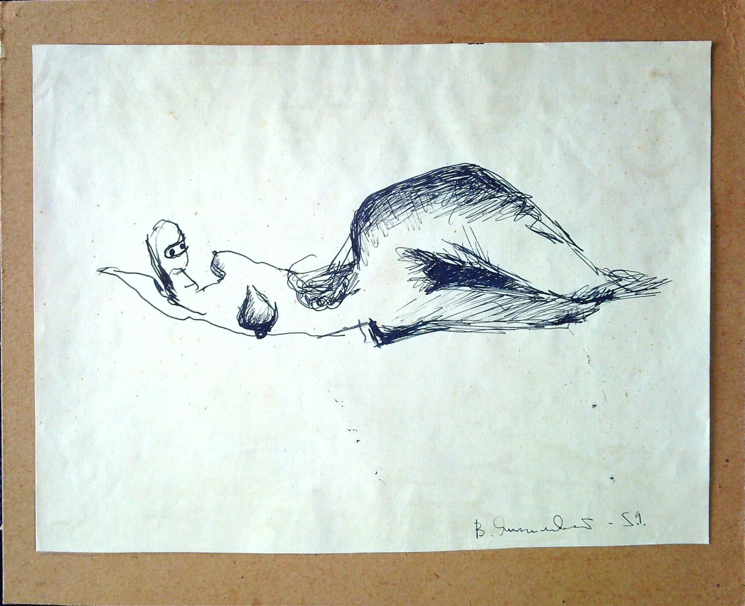 | Perokresba autorem signovaná a datovaná perem vpravo dole. List je při horním a spodním okraji ve dvou bodech přichycen k podkladovému kartonu. Práce pochází ze sbírky Jiřiny Hamzové, výtvarné redaktorky, která ve druhé polovině 60. let s Františkem Chalupeckým navštívila Moskvu a řadu ateliérů neoficiálních ruských umělců. |