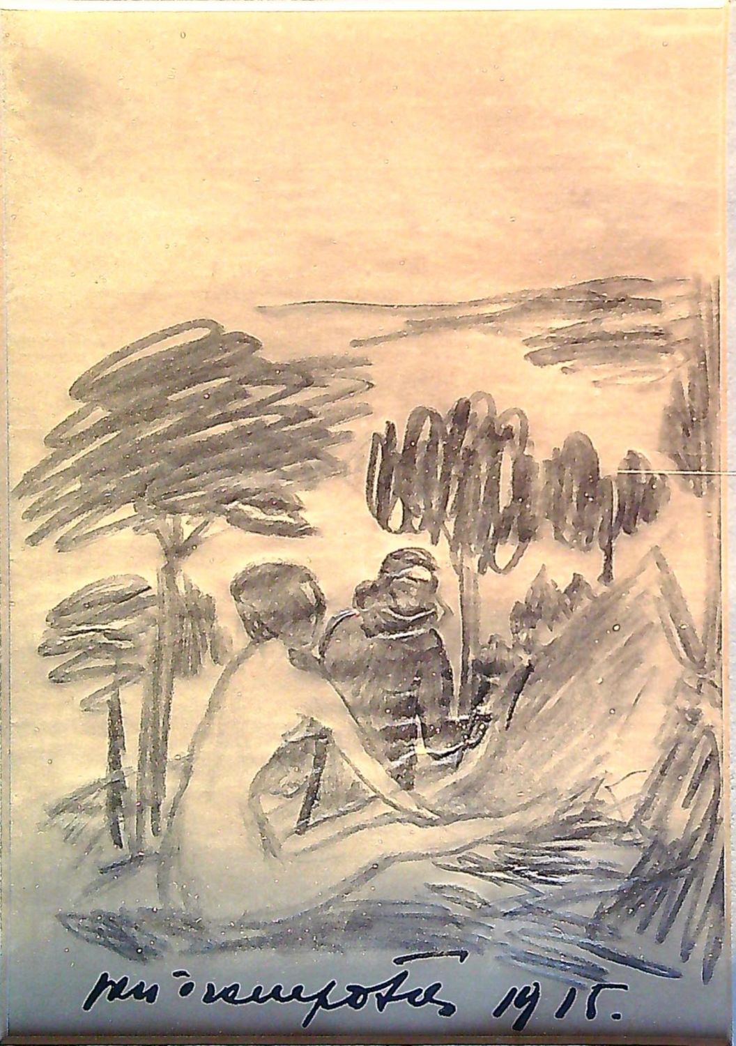 | Kresba tužkou, pod kresbou černým perem autorem podepsaná a datovaná. - Práce je vložena v hluboké kartonové paspartě a zasazena do béžového dřevěného rámu se zlacenými linkami. |