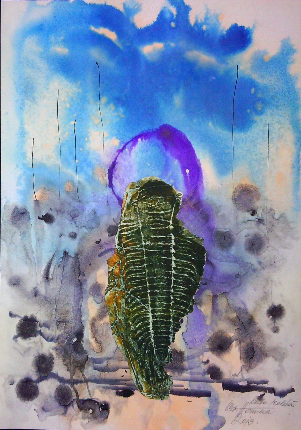 | Lavírovaná malba akvarelem a tuší kombinovaná s koláží, volný list vpravo dole autorem tužkou podepsaný a datovaný. |