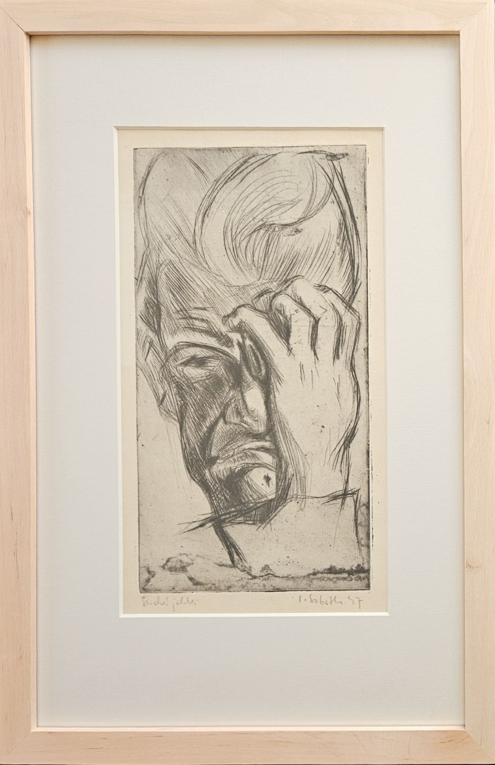| Suchá jehla autorem vpravo dole pod deskou podepsaná a datovaná, vlevo dole autorem napsána technika. Práce je adjustována v hluboké paspartě a zarámována ve světlém přírodním rámu z olše. |