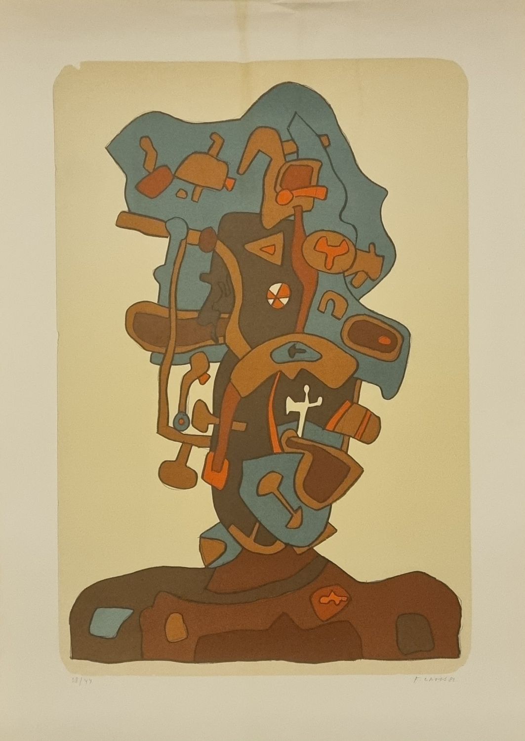 | Barevná litografie vpravo dole autorem tužkou podepsaná a datovaná, vlevo dole číslo tisku 38/44, volný list. Papír při horním okraji uprostřed lehce pomačkaný a uprostřed od horního okraje v délce cca 10 cm světle hnědá šmouha. |