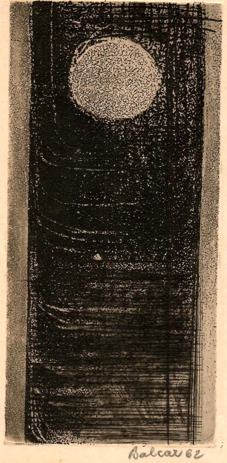 | Akvatinta z roku 1962, volný list o rozměru desky 150 x 78 mm (rozměr celého papíru 170 x 90 mm), signovaný a datovaný tužkou vpravo dole. Na rubu při spodním okraji přípis perem od předchozího majitele o technice, jménu autora a datace. |