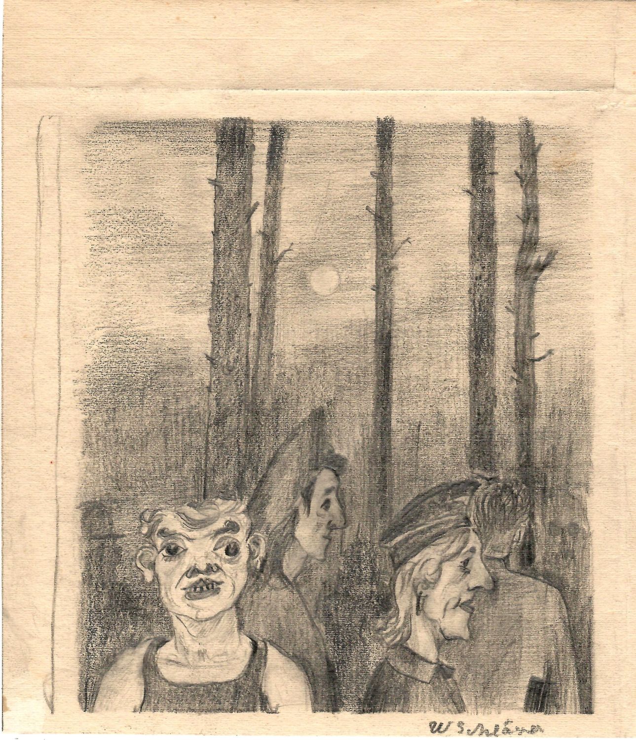 | Kresba tužkou, volný list o rozměru 242 x 217 mm. V pravém spodním rohu autorem tužkou signovaná. .<br>Wilhelm Schläger (20.2. 1907 Berlin- 25.11. 1990 Hanover), německý malíř, v letech 1946-1980 člen Berufsverband bildender Künstler Berlins. Jeho práce z konce 20. a počátku 30. let jsou nepochybně ovlivněny znalostí díla G. Grosze, především jeho zkratkovitostí a smyslem pro groteskní až obludné vyjádření poměrů ve zvolna se potápějící Výmarské republice. |
