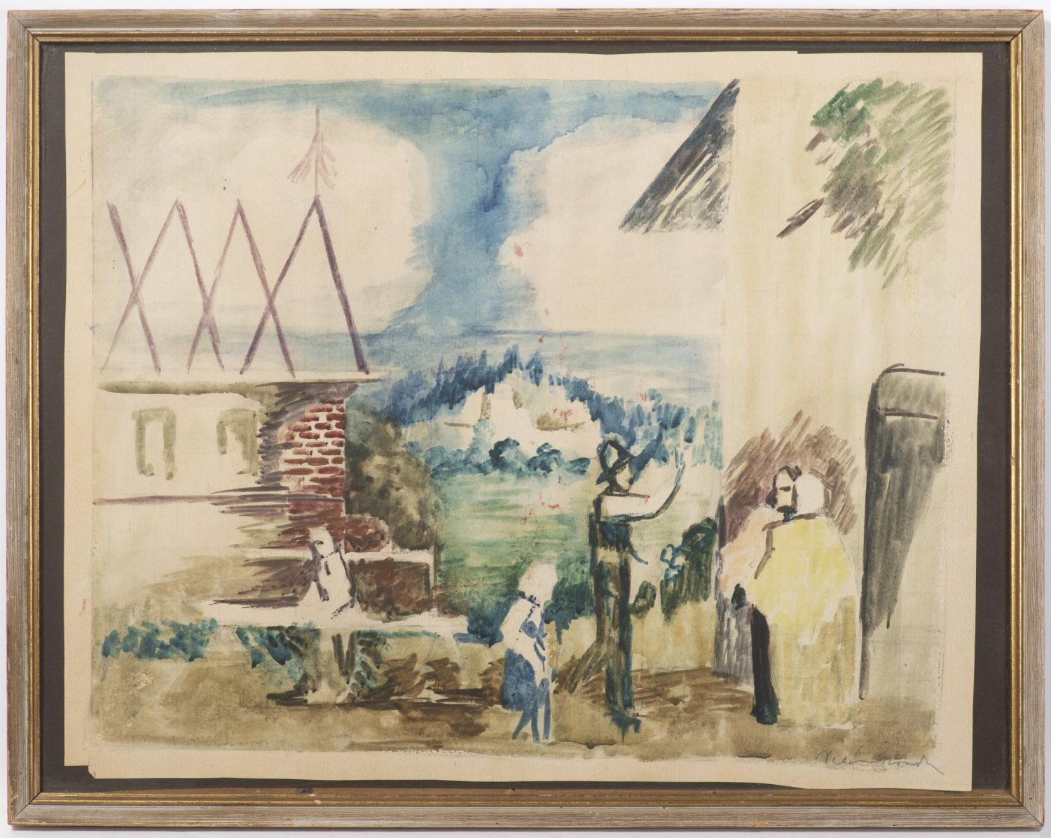 | Akvarel na papíře, autorem vpravo dole tužkou signovaný. Zarámováno v úzkém dřevěném rámu o rozměru 385 x 490 mm, jehož vnitřní okraj je olemovaný dvojitou zlatou linkou. |