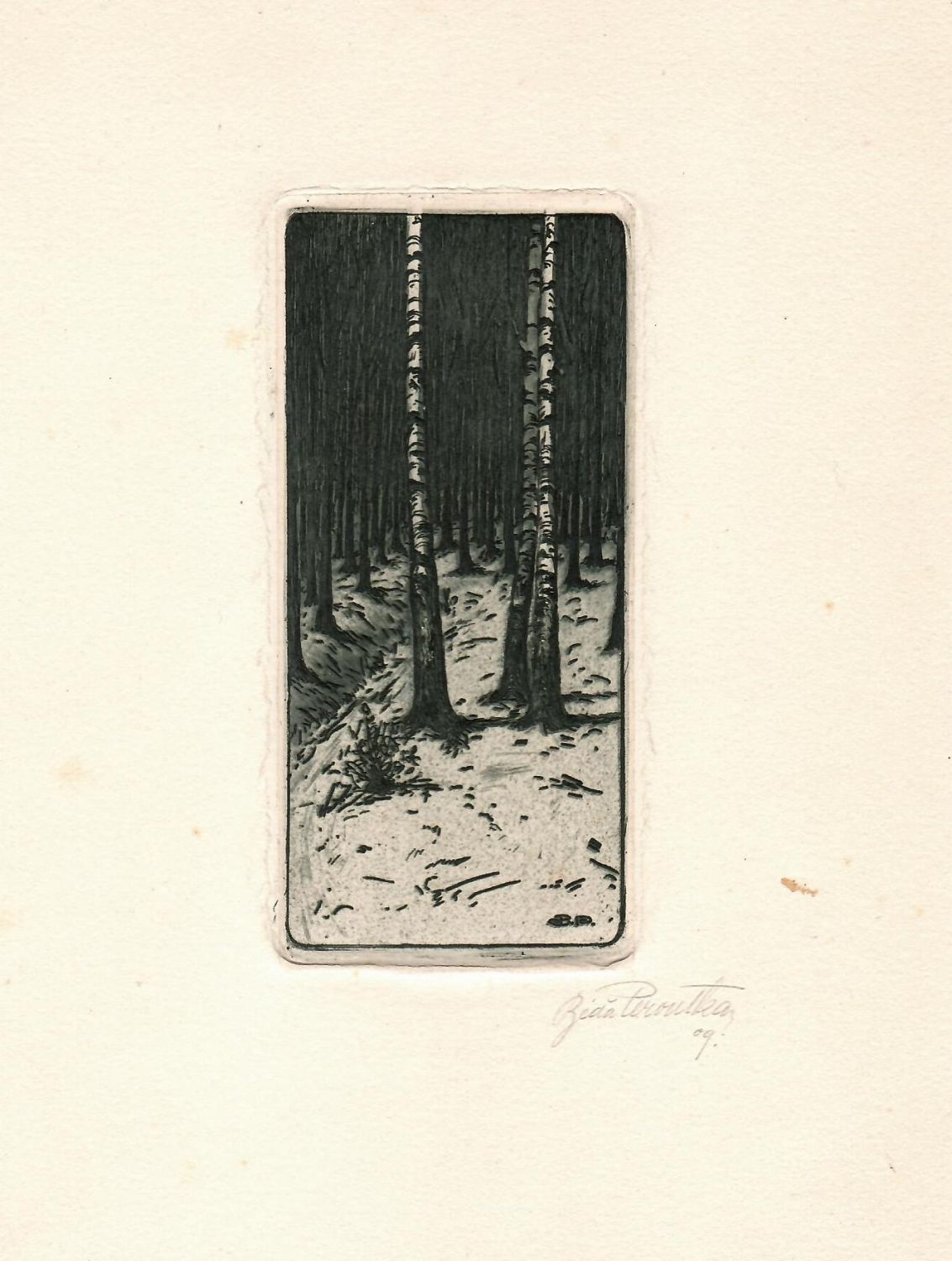 | Lept o rozměru tisku 137 x 65 mm. Tisk je autorem vlepen a vmáčknut do silného podkladového papíru. Při pravém spodním okraji tisku tužkou signováno a datováno. Místy světle hnědé flíčky, které nezasahují do grafiky. Levý spodní růžek podkladového papíru ohnut. |