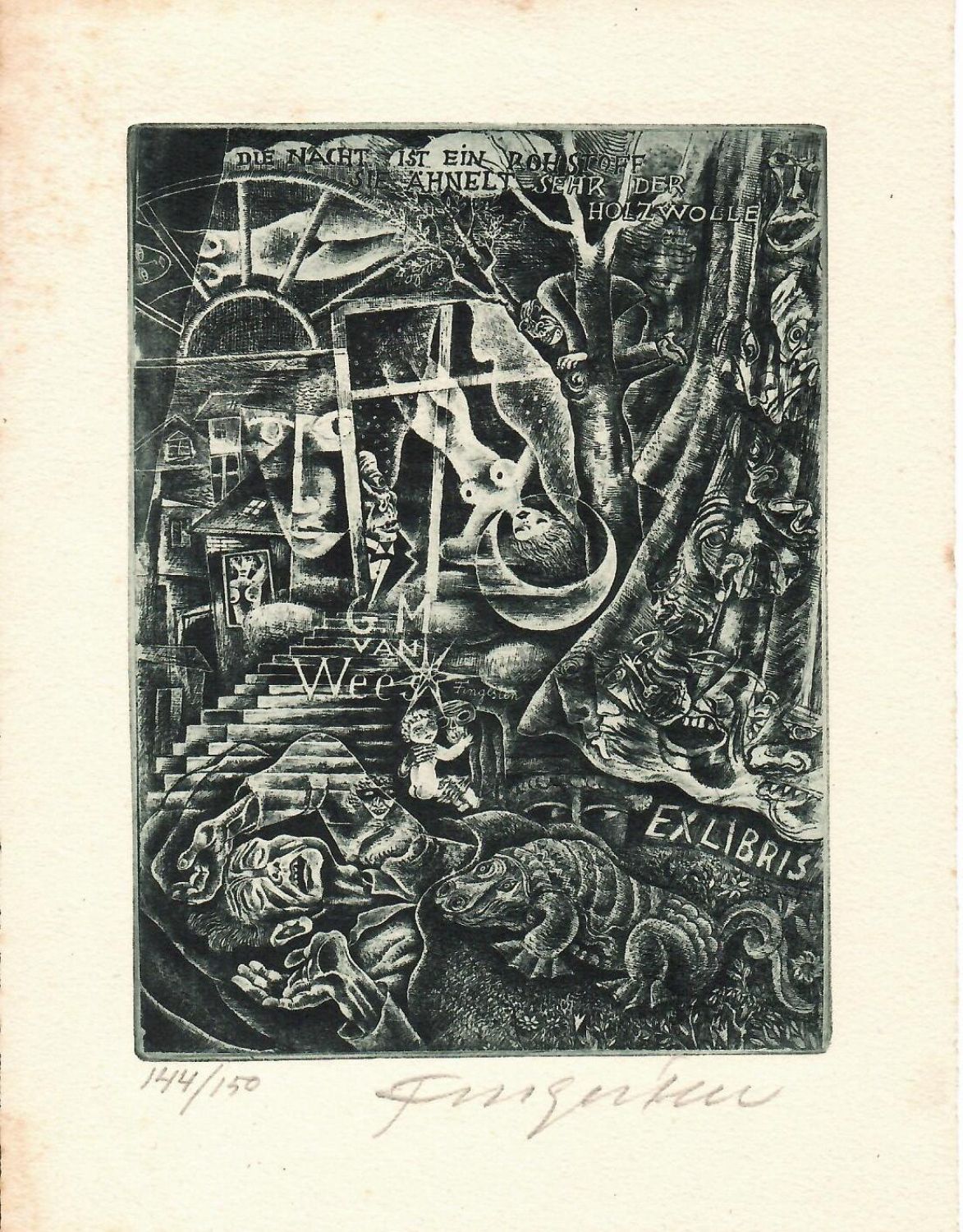 Die Nacht ist ein Rohstoff sie ähnelt sehr der Holzwolle. Ex libris G. M. van Wees. [Schlafender mit Alptraum].