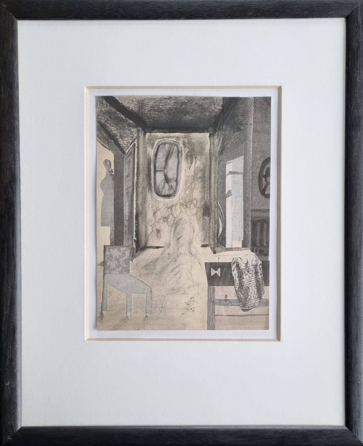 | Kombinovaná technika - koláž, kresba tuší, kresba uhlem. Nesignováno. Rámováno v hluboké bílé paspartě a černém dřevěném rámu. |