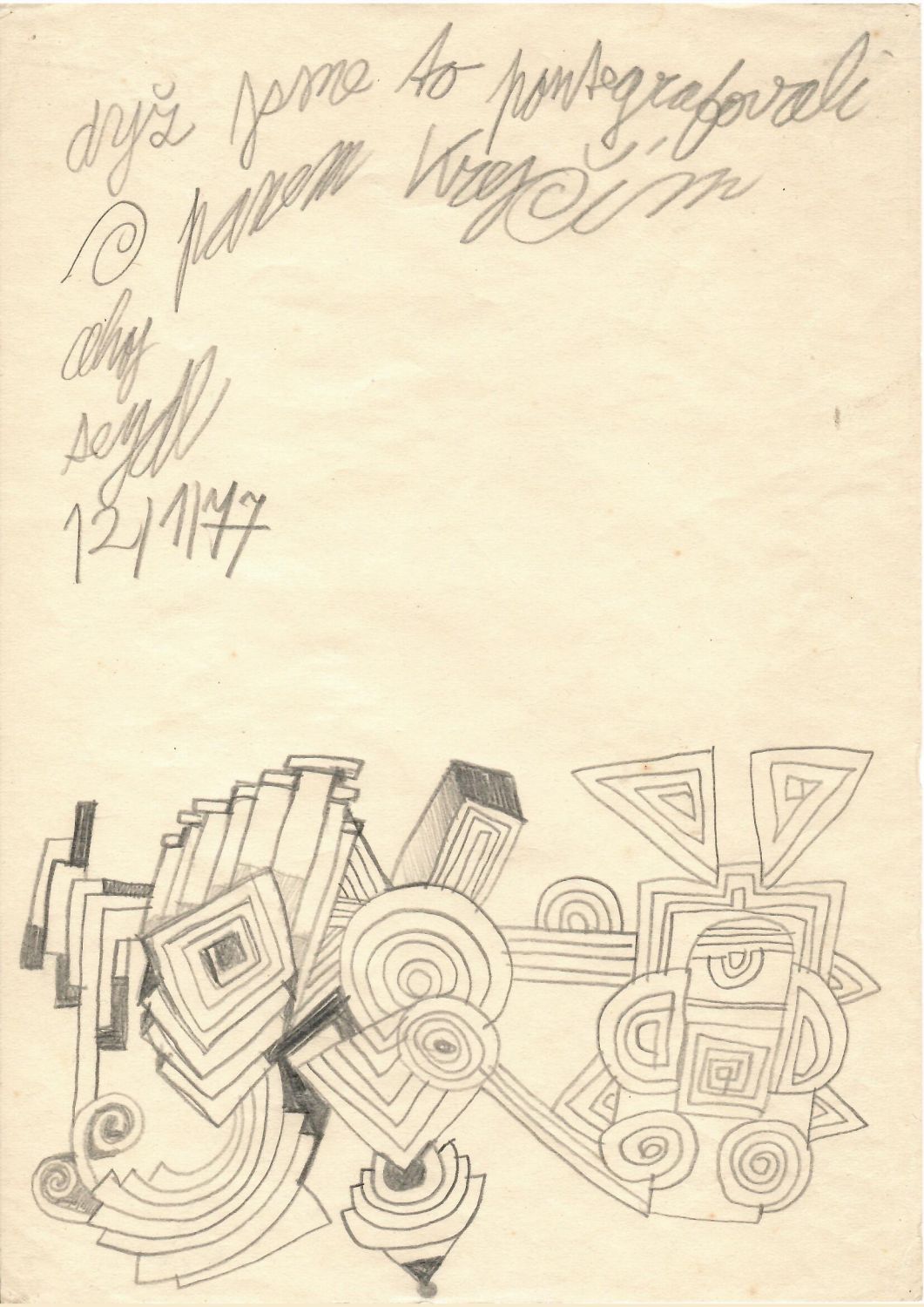 | Kresba tužkou s nápisem "dyž jsme to pontegrafovali s panem Krejčím ahoj seydl 12/1/77". Na zadní straně papíru stopy po předchozím uchycení k podkladovému papíru. |