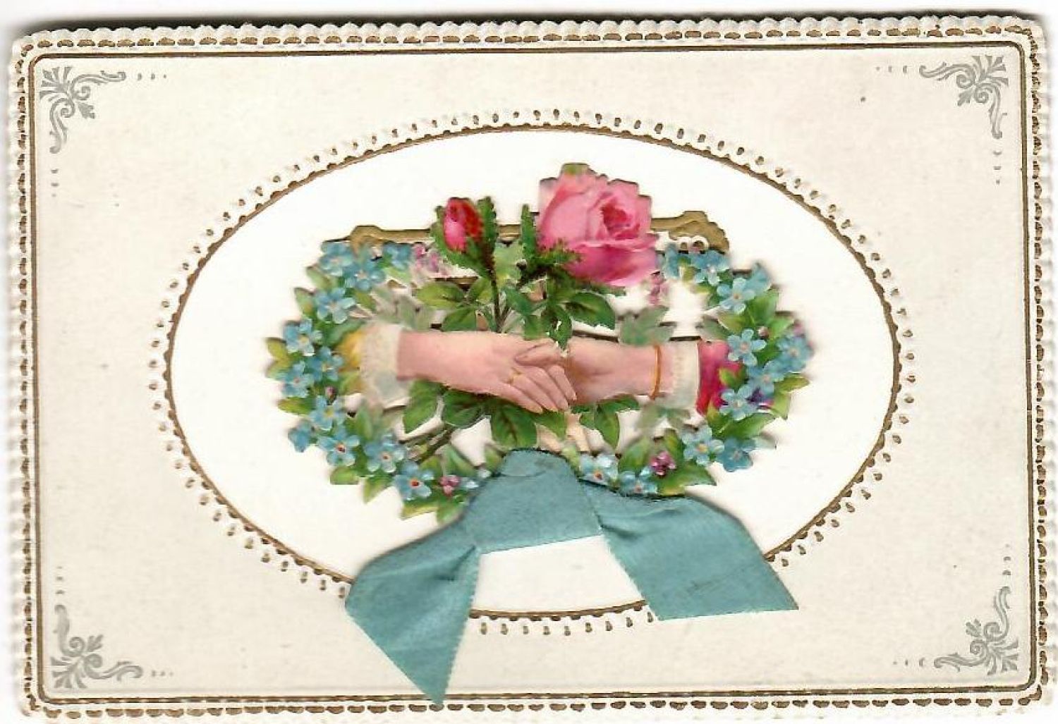 | Papírové přání s ozdobným okrajem. Na prostředku pohyblivá vystřihovánka s látkovou mašlí. Po odsunutí vystřihovánky se objeví nápis "Štěstí a blaženost". |