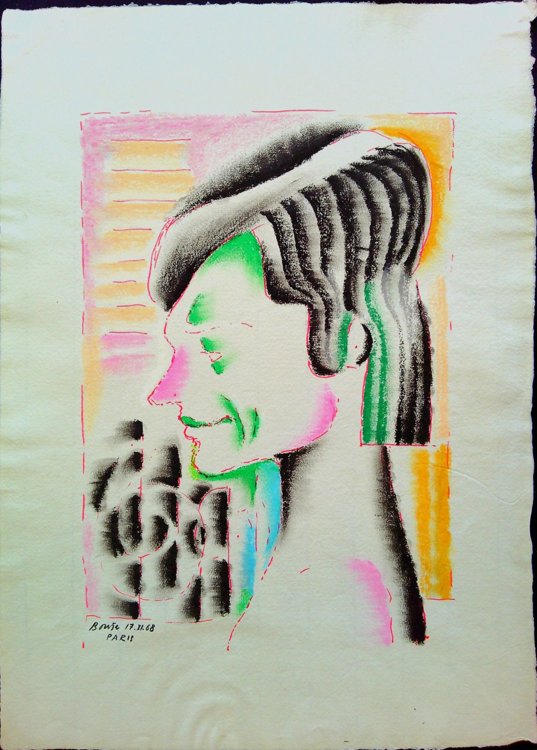 | Akvarel, tuš. Malba na ručním rýhovaném papíře, vlevo dole autorem perem podepsaná a datovaná ("17. XI. 68 Paris"). |