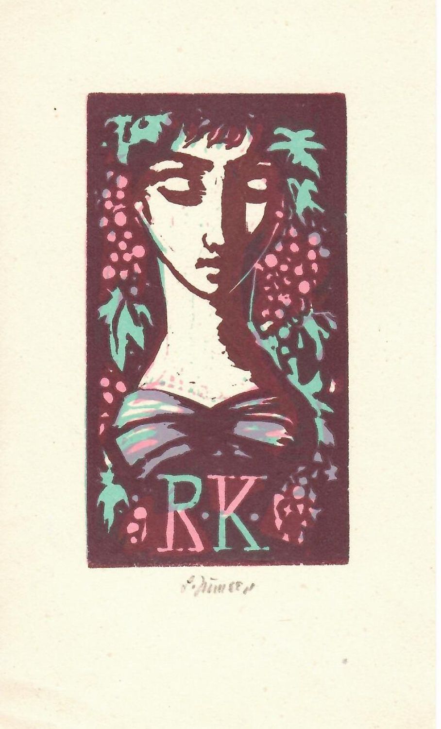 | Tříbarevný linoryt, volný list uprostřed dole pod deskou autorkou tužkou podepsaný, v desce vyryt monogram R.K. (Rudolf Klinkovský), na rubu autorčino razítko. (Soupis č. 767) |