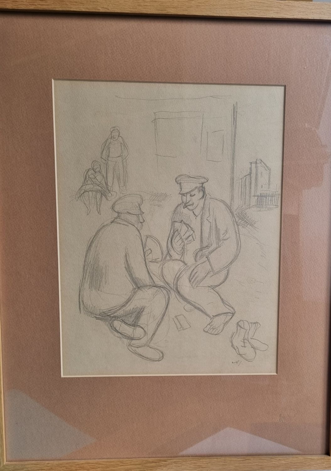 | Kresba tužkou vpravo dole autorem iniciálami signovaná. Kresba je zasazená do hluboké papírové pasparty a zarámovaná ve světlém přírodním rámu. |