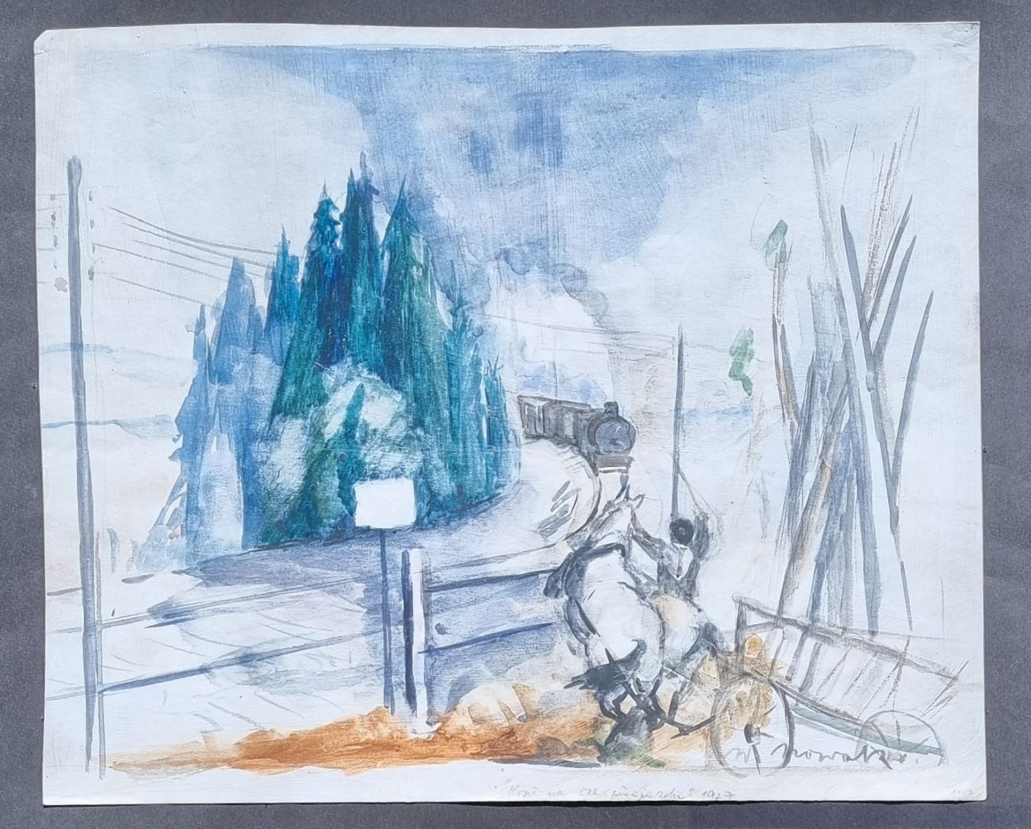 | Akvarel při pravém spodním okraji podepsaný, volný list při horních okrajích uchycený k podkladovému papíru (varianta malby je reprodukována v monografii V. Formánka Vilém Nowak, obrázek 100). |