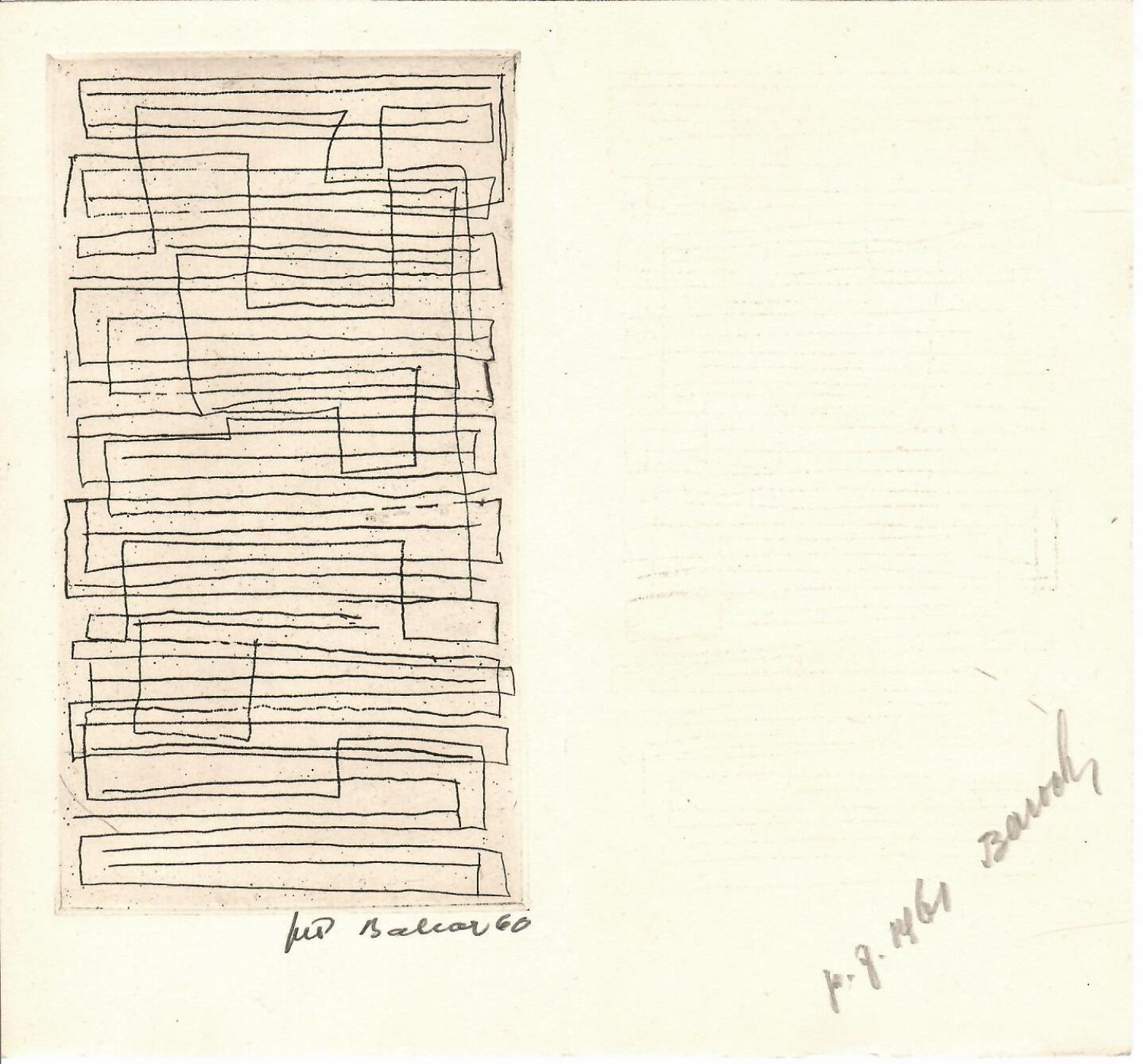 | Původní lept, vpravo dole pod deskou autorem tužkou podepsaný a datovaný, v levé části uprostřed přeloženého listu lept, v části pravé tužkou připsáno P.F. 1961 Bauch. |