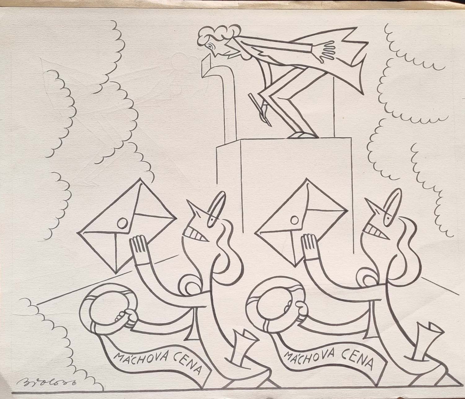 | Kresba tuší, v levém spodním rohu listu autorem signováno a datováno. Při horním okraji listu zbytek papírové lepicí pásky (lepeno k zadní straně listu). Volný list. |