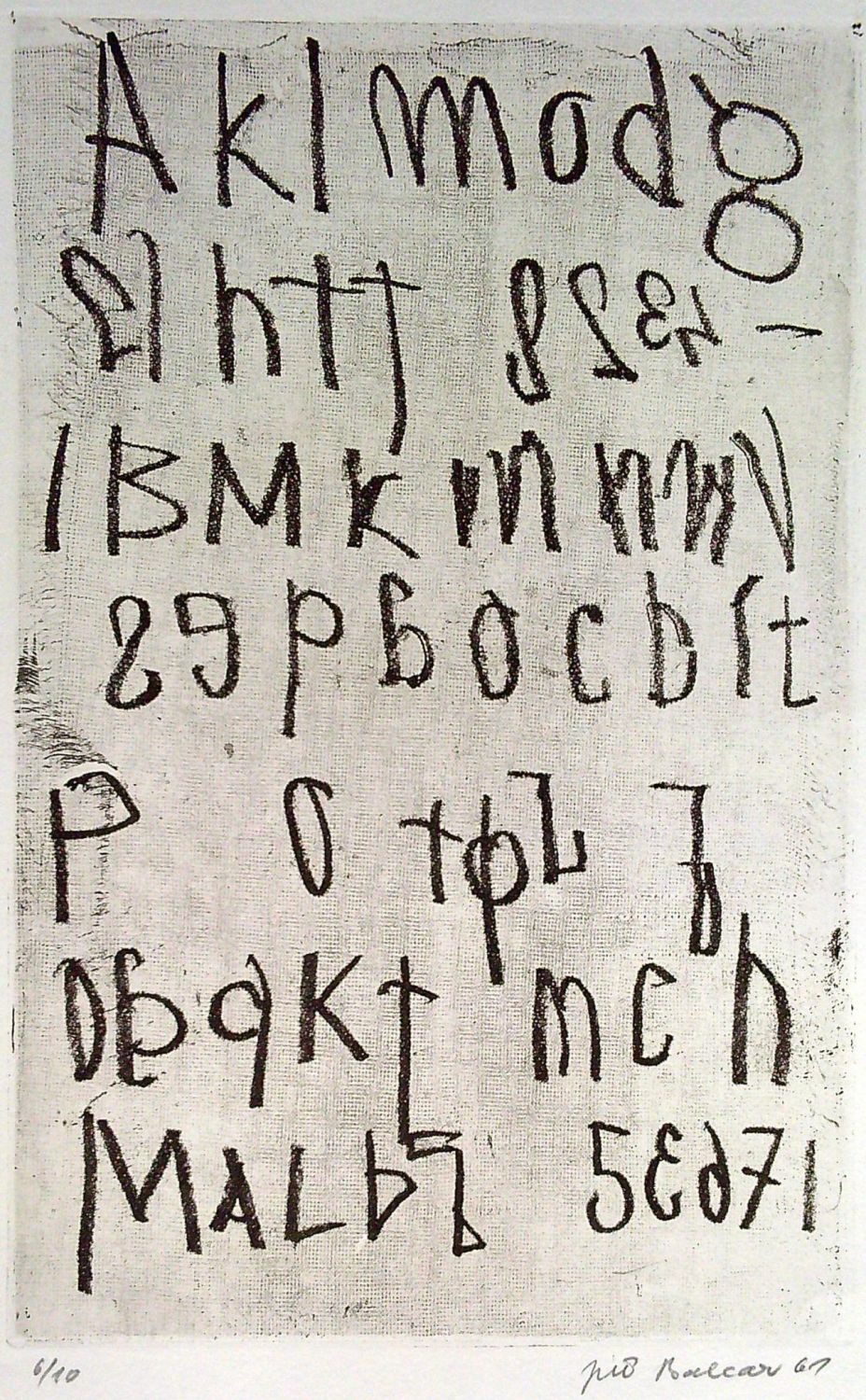| Měkký kryt o rozměru desky 245 x 160 mm, tištěný na papír C. M. Fabriano 480 x 338 mm, vpravo dole autorem tužkou podepsaný a datovaný, vlevo dole číslovaný 6/10. Reprodukováno v monografii Marie Klimešové a Jana Rouse "Jiří Balcar", str. 80, obr. 91. - Provenience: zakoupeno od autorova syna.<br>ID 21396 |