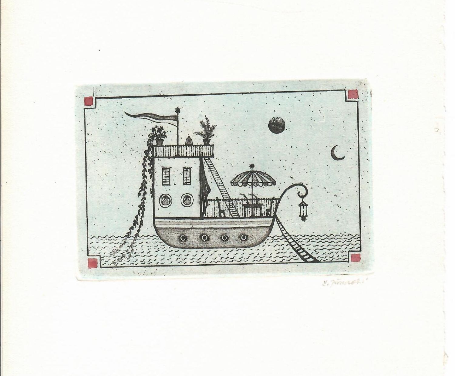 | Kolorovaný lept, volný list autorkou vpravo dole pod deskou tužkou podepsaný. (Soupis graf. díla L. Jiřincové 608-13). Jiřincová vytvořila v roce 1957 cyklus 6 leptů ke sbírce Kamila Bednáře "Očarované lodi", která vyšla v Edici J (Ludmila Jiřincová) pouze v počtu několika zkušebních výtisků. Roku 1973 vydal knihu Klub přátel výtvarného umění v Gottwaldově k nedožitým šedesátinám Kamila Bednáře v počtu 60 exemplářů s původními lepty. Světle modrá varianta. |