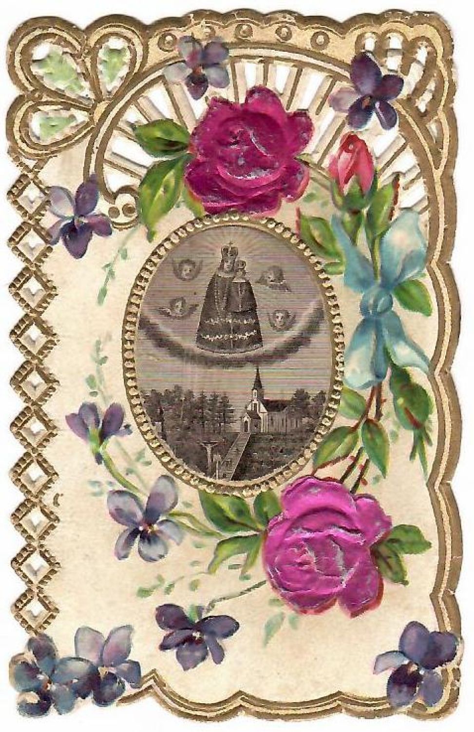 | Barevný tisk na krajkovém papíře s rytinou ve středu. Na zadní straně německy psaný text. |