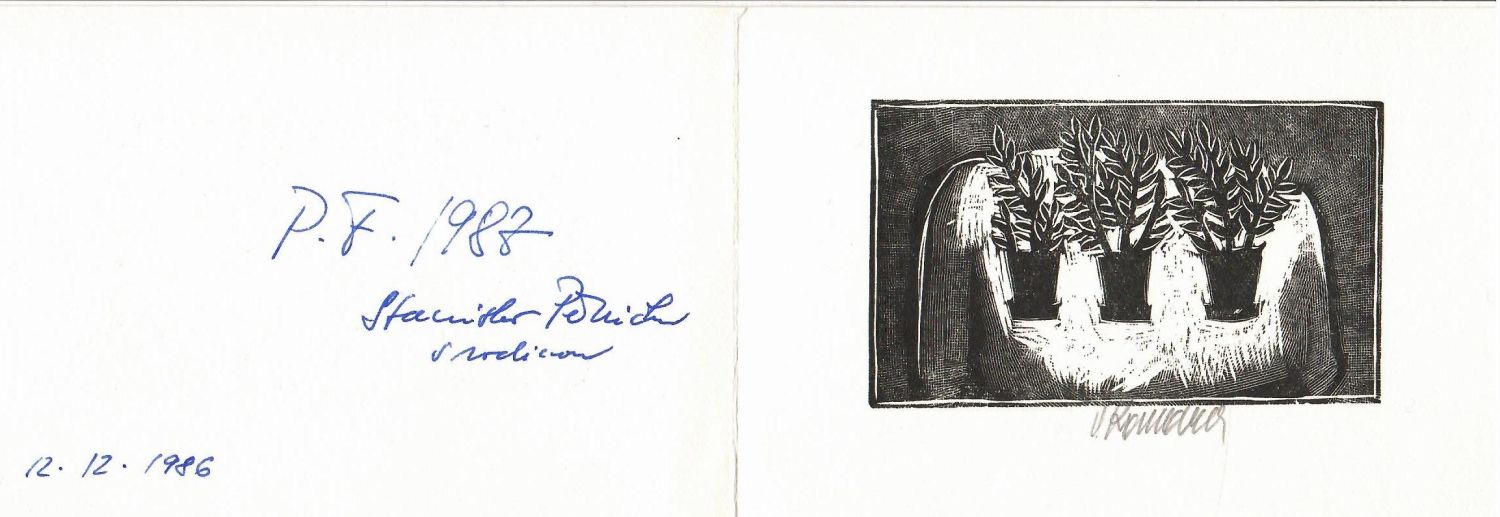 | Dřevoryt, autorem při spodním okraji tisku tužkou signováno. Na protější straně listu modrým inkoustem připsáno P.F. 1987 Stanislav Pěnička s rodinou. 12.12.1986. |