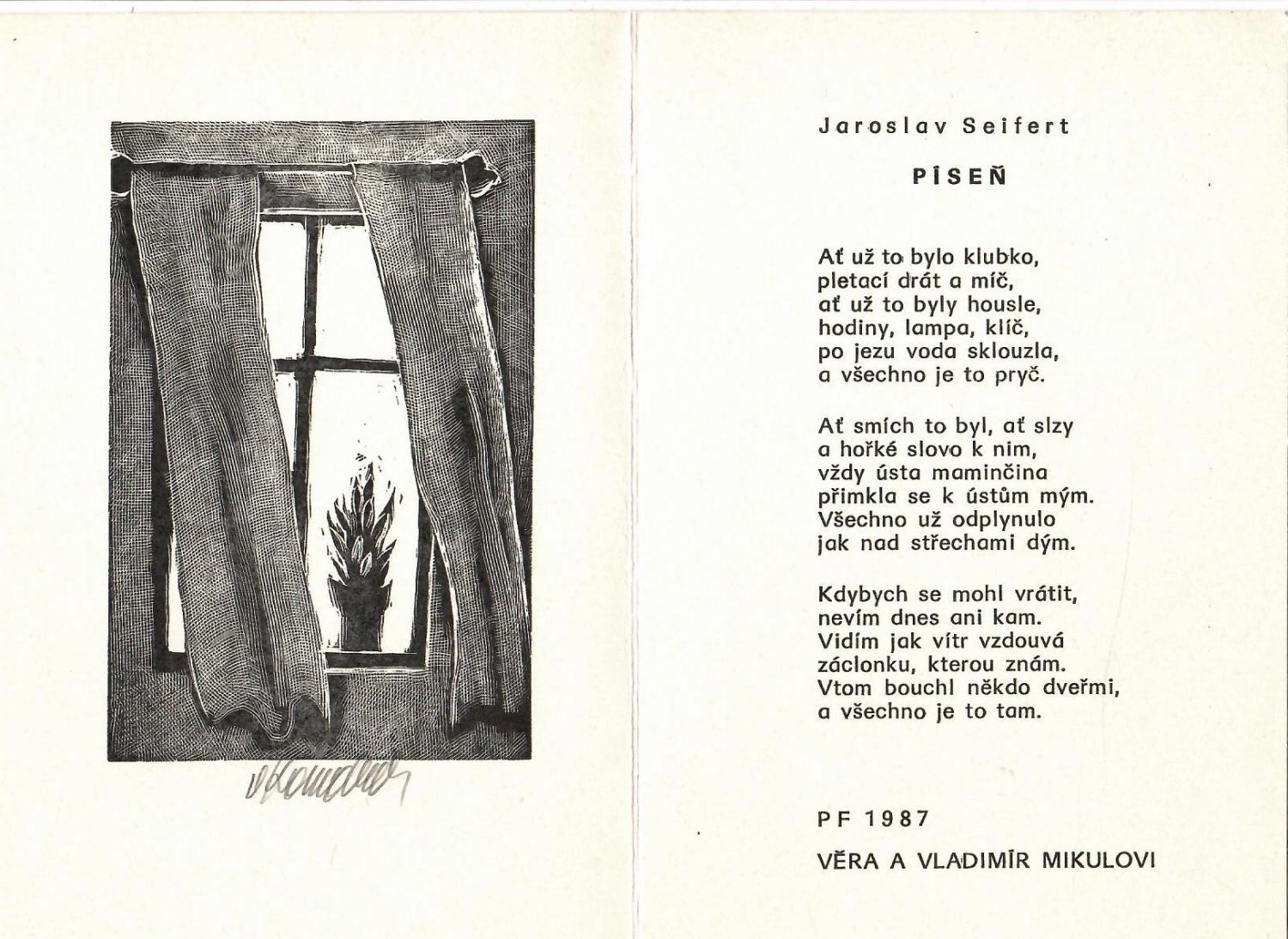 | Dřevoryt, při spodním okraji tisku autorem tužkou signováno. Na protější straně listu báseň od Jaroslava Seiferta. |