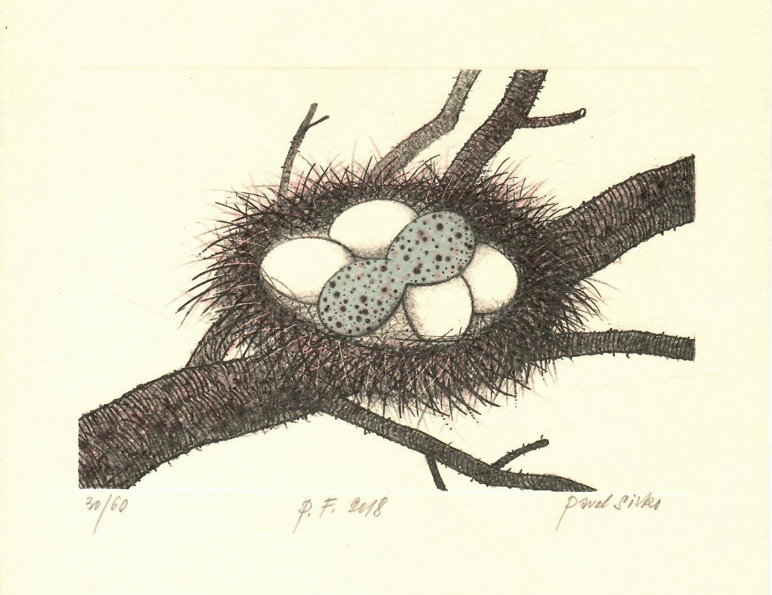 | Barevná litografie, autorem při spodním okraji tisku tužkou signováno, připsáno P.F.2018 a číslováno. Č.ex. 30/60. Volný list. |