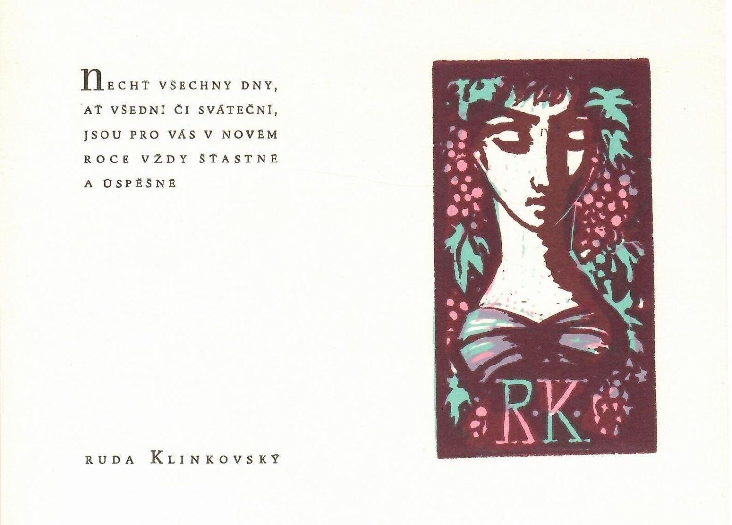 | Trojbarevný linoryt, na protější straně tisku text "Nechť všechny dny, ať všední či sváteční, jsou pro Vás v novém roce vždy šťastné a úspěšné. Ruda Klinkovský". Autorkou nesignováno. |