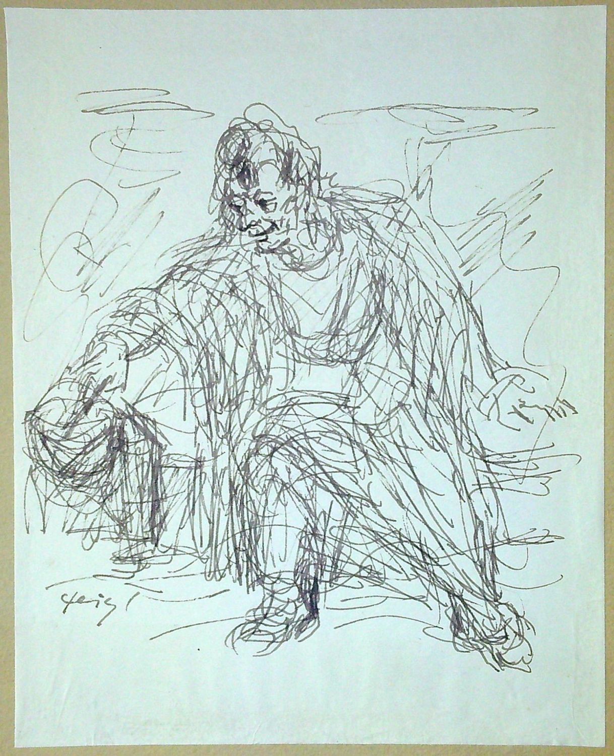 | Perokresba, podepsaná autorem vlevo dole. Bílý papír, na které je kresba vytvořena je po celé ploše nalepen na světle hnědý tužší papír. |