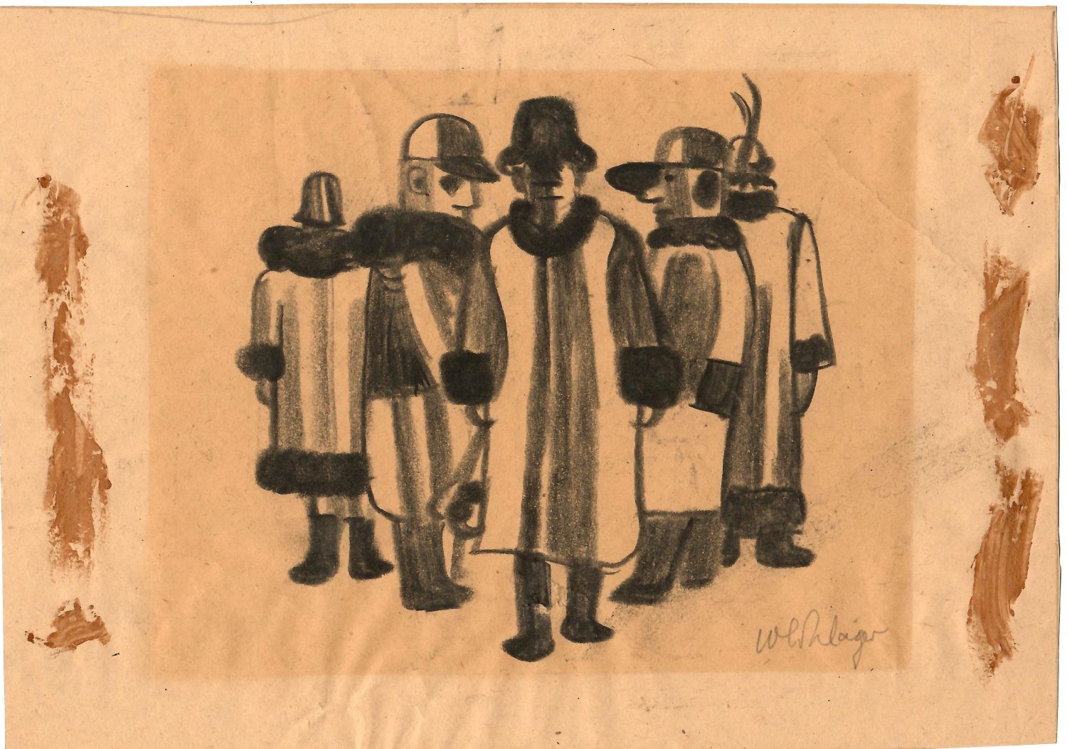 | Kresba uhlem, volný list o rozměru 193 x 272 mm. Při pravém i levém okraji hnědé skvrny (stopy po lepidle), okraje, které byly kryty paspartou, mají lehce světlejší odstín. Kresba vpravo dole autorem tužkou signována.<br>Wilhelm Schläger (20.2. 1907 Berlin - 25.11. 1990 Hanover), německý malíř, v letech 1946-1980 člen Berufsverband bildender Künstler Berlins. Jeho práce z konce 20. a počátku 30. let jsou nepochybně ovlivněny znalostí díla G. Grosze, především jeho zkratkovitostí a smyslem pro groteskní až obludné vyjádření poměrů ve zvolna se potápějící Výmarské republice. |