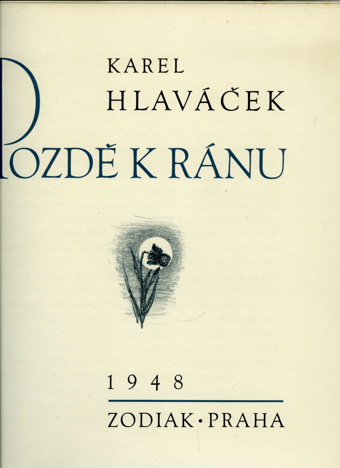 | Cyklus deseti litografií Karla Štiky k básnické sbírce Karla Hlaváčka "Pozdě k ránu". Praha, Svatopluk Klír, edice Zodiak, sv. XXIV, 68 stran + 4 listy (poslední dva čisté). Exemplář číslo XX ze I - LXXV tištěných na velínovém papíru. Deset původních celostránkových litografií vpravo dole autorem tužkou podepsaných, litografická viněta na titulním listě a značka v tiráži, v tiráži též podpis Štikův perem. Původní papírová obálka s chlopněmi, ve které jsou volně vložené složené tiskové archy. Obálka při hřbetu lehce odřená. |