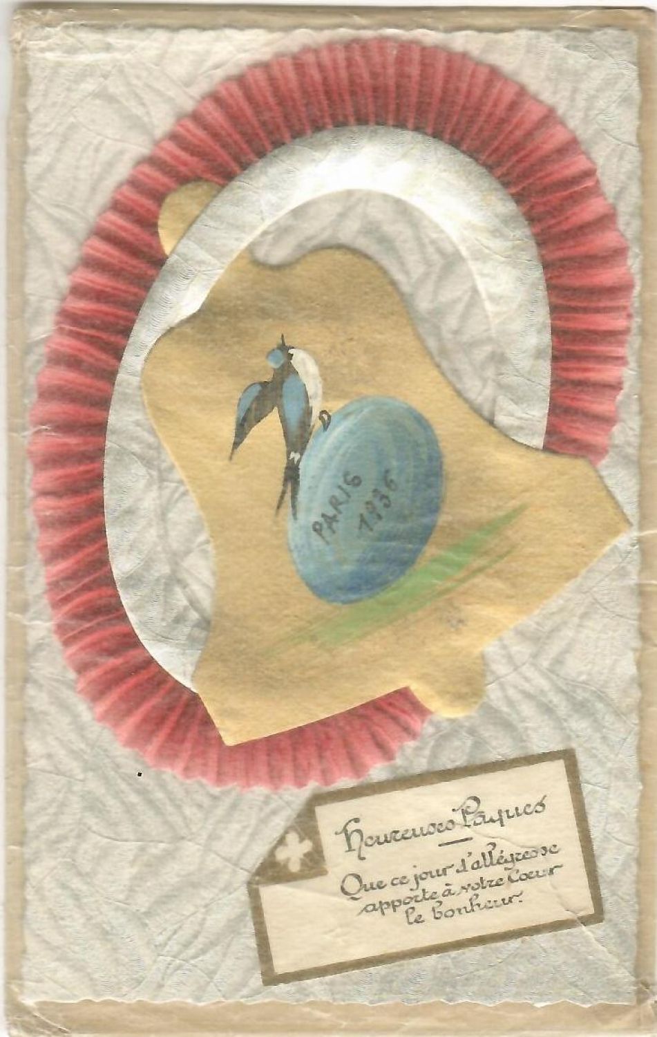 | Francouzské velikonoční přání z roku 1936 zdobeno látkou a vystřihovánkou. |
