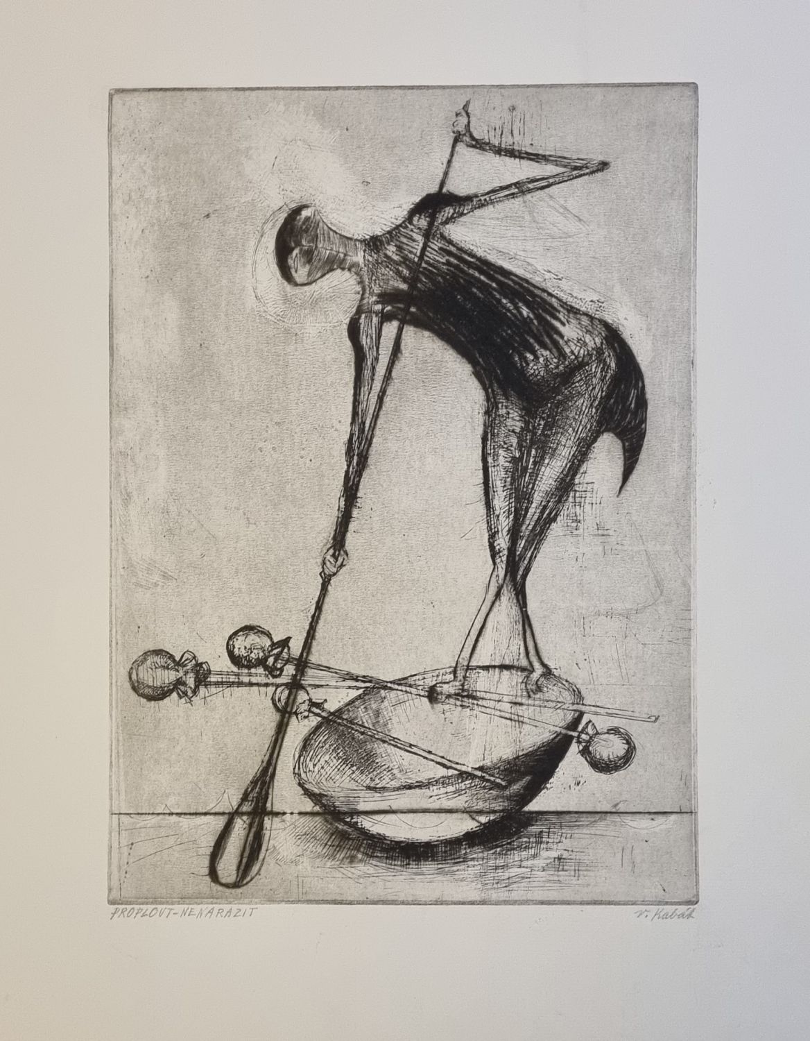 | Lept, při levém spodním okraji tužkou připsán název "Proplout - nenarazit", při pravém spodním okraji tisku autorem tužkou signováno. Volný list. |