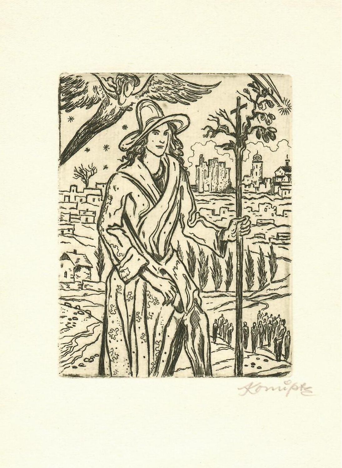 | Lept. Autorem při spodním okraji tisku tužkou signováno. Volný list, frontispis z knihy Eugena Demoldera "Štědrý večer" (nakl. Josef Portman). |