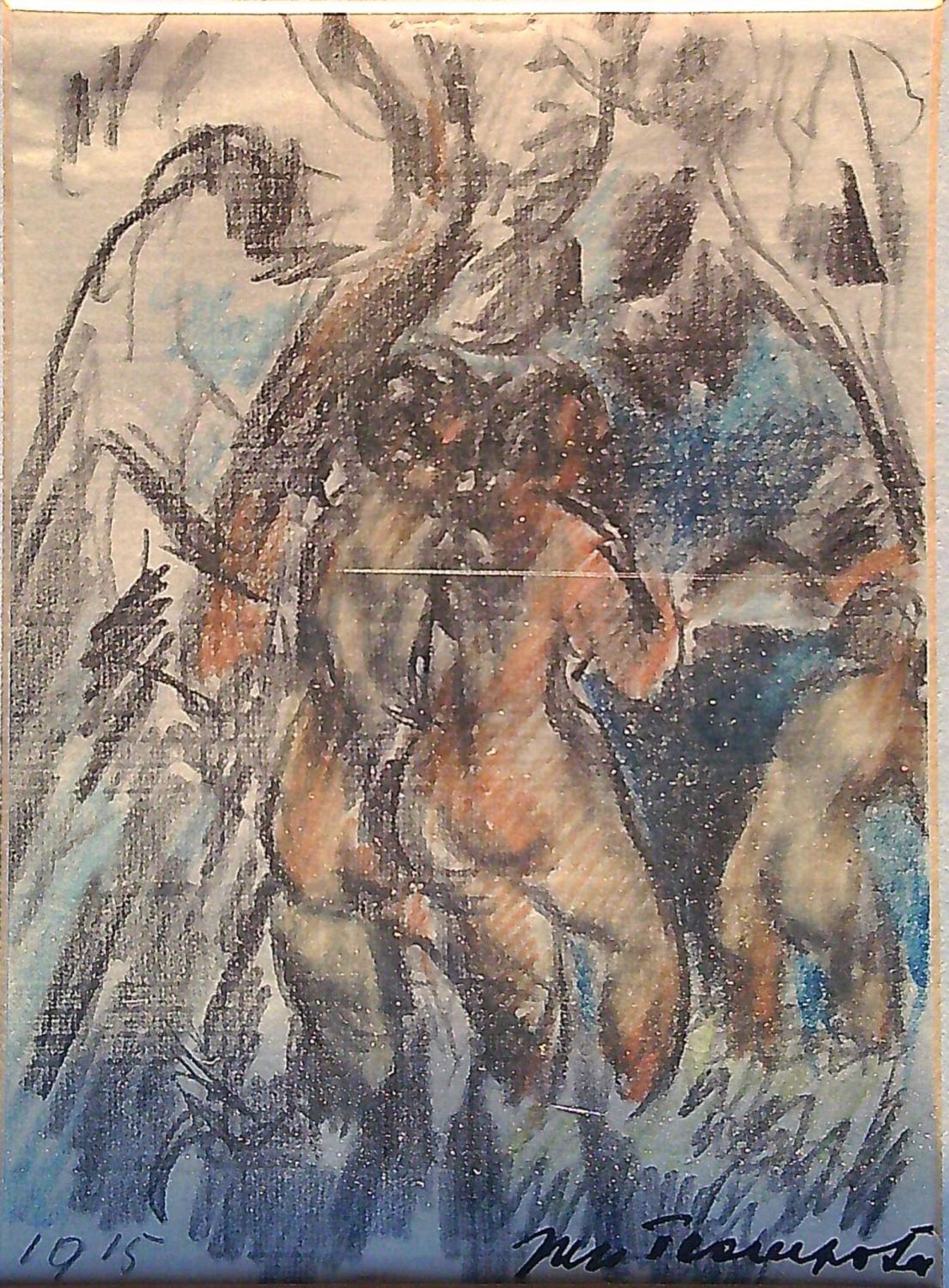 | Kresba tužkou a barevnými pastelkami, vpravo dole autorem černým perem podepsaná, vlevo dole autorem tužkou datovaná. - Práce je vložena v hluboké kartonové paspartě a zasazena do béžového dřevěného rámu se zlacenými linkami. |