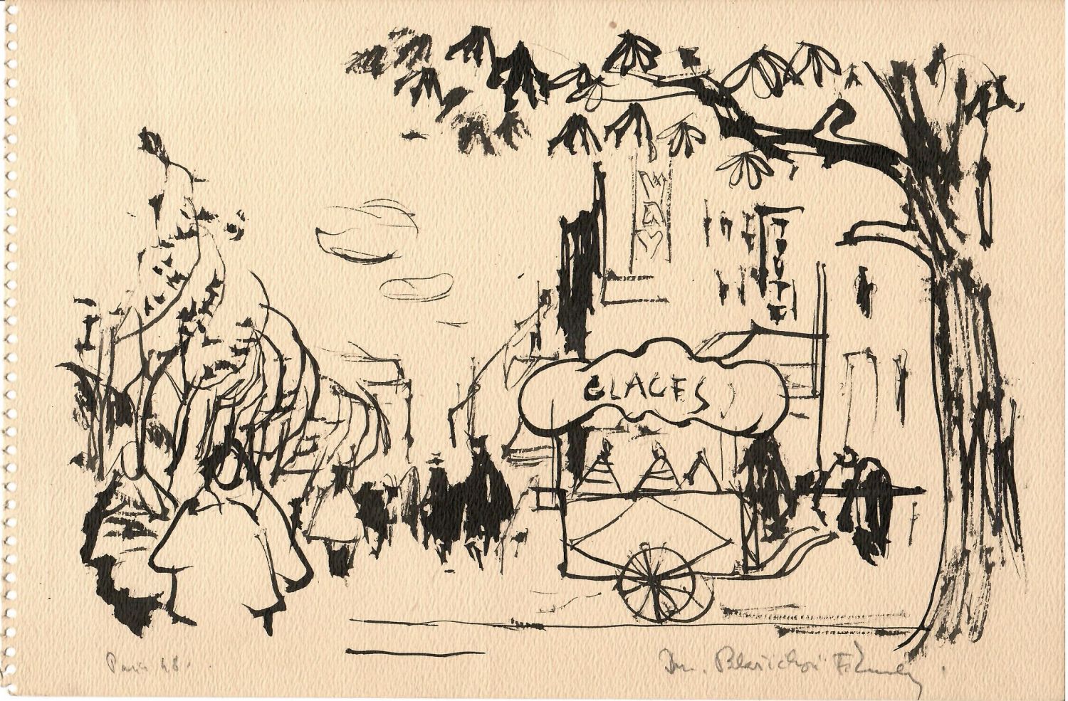 | Kresba tuší na čtvrtce vytržené z bloku. Vpravo dole autorem tužkou podepsáno s přípisem "Dr. Blažíčkovi", vlevo dole datace Paris 48. |