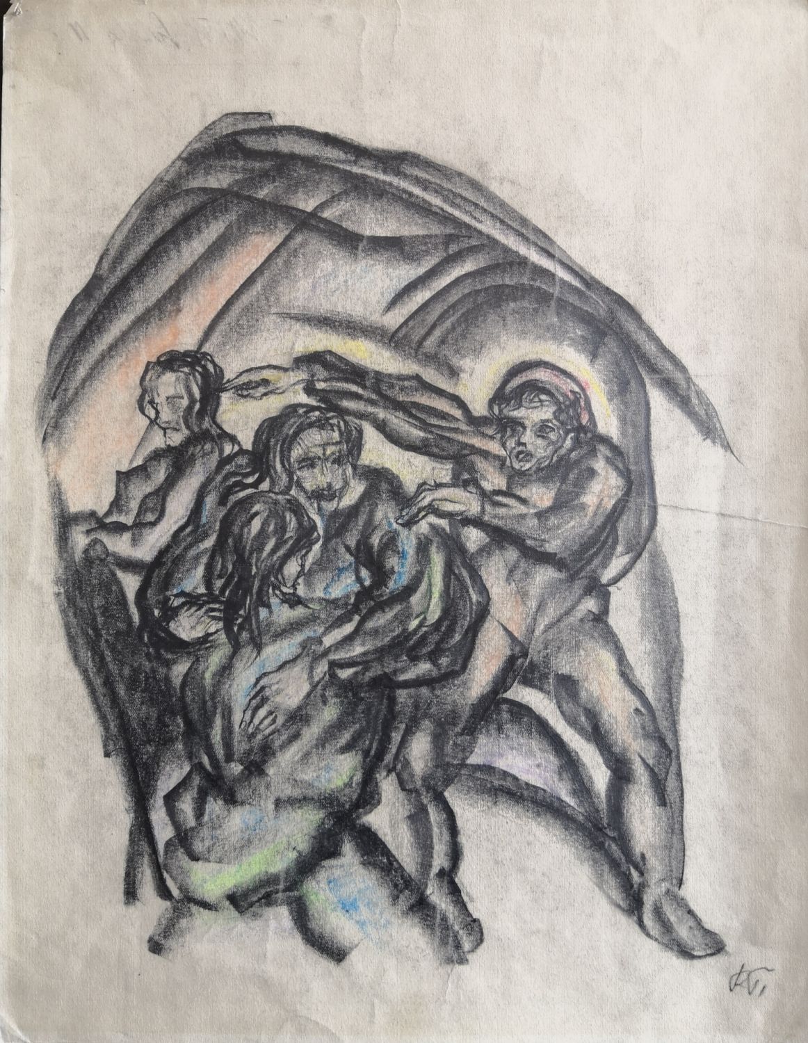 | Kresba tužkou a pastelkami na papíře o rozměru 395 x 295mm, vpravo dole signovaný monogramem, na rubu při horním okraji celým jménem a názvem.<br>Práce byla vystavena na výstavě "Vzplanutí" v Olomouci v roce 2008. Číslo katalogu 188..<br>Otto Rudolf Schatz (18.1. 1900 Wien - 26.4. 1961 Wien), rakouský malíř a grafik. V letech 1915-1919 studoval ve Vídni na Umělecko-průmyslové škole, kde byl žákem Oskara Strnada. V roce 1925 mu byla udělena rakouská státní cena, v letech 1928-1938 byl členem vídeňského Hagenbundu, od roku 1946 Vídeňské secese. Zabýval se též ilustrací, vyzdobil řadu literárních prací a publikací pro sociálně demokratickou stranu (ve třicátých letech byl v Rakousku jedním z mála společenskokritických autorů). V letech 1936-37 pobýval ve Spojených státech amerických (nějakou dobu také v New Yorku). V roce 1938 mu bylo v Rakousku zakázáno pracovat, a tak téhož roku se svou ženou, která byla Židovka, emigroval do Brna, rodného místa manželky. Od roku 1939 pobývali v Praze, roku 1944 byl zatčen gestapem a umístěn do koncentračního tábora pro míšence v Bystřici u Benešova. Po válce se vrátil do Vídně.<br>Schatz byl především krajinář, maloval také žánry a zátiší. Jeho raně expresivní tvorbu vystřídala ve dvacátých letech inspirace novou věcností, počátkem 40. let se vrátil zpět ke svým expresivním kořenům. Namaloval také několik obrazů s tematikou Prahy. |